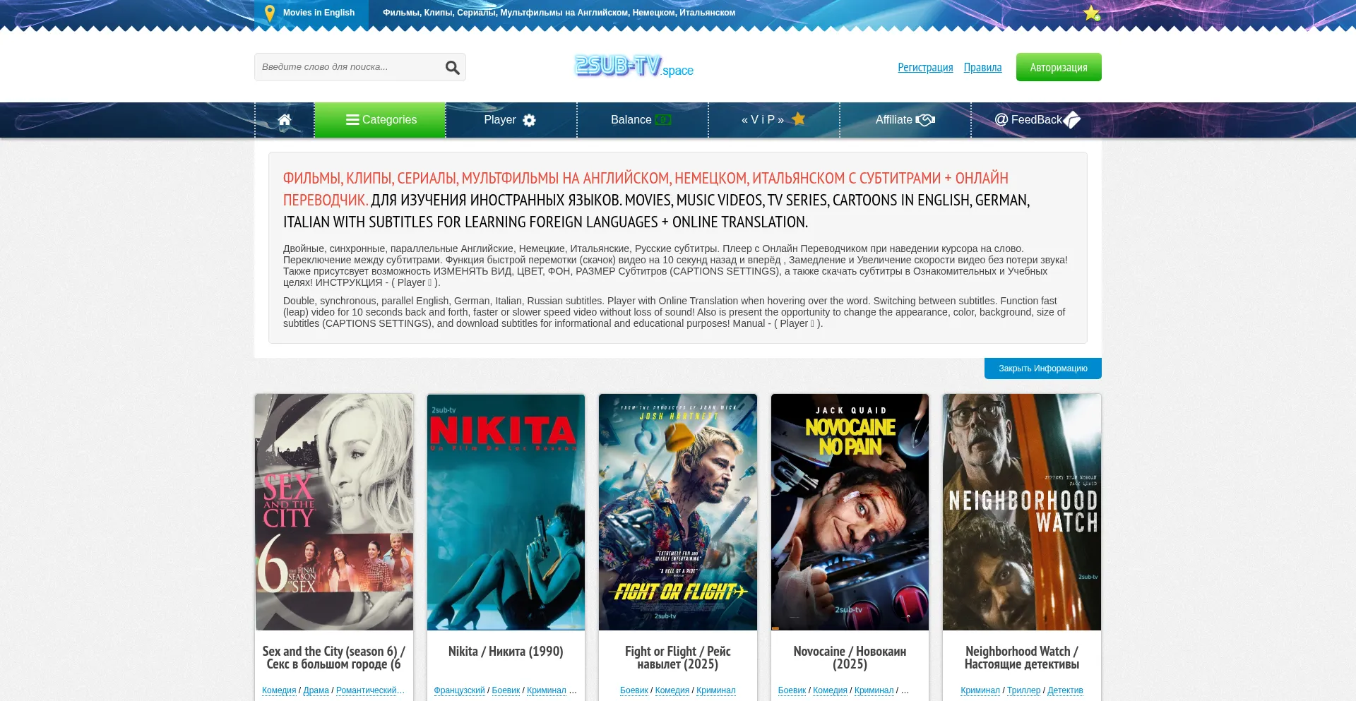 Фильмы, сериалы, клипы, мультфильмы на английском, немецком, итальянском в оригинале онлайн. Двой...
