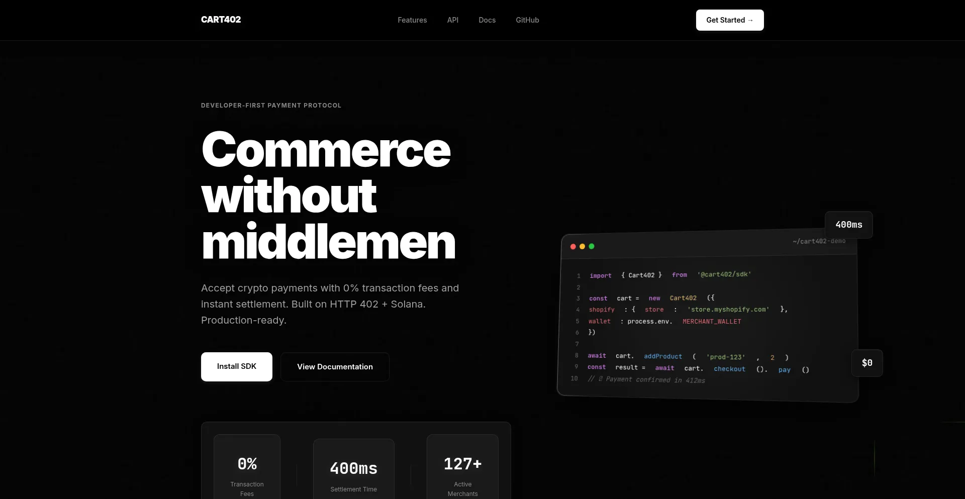 Accept crypto payments with 0% fees and instant settlement. Built on HTTP 402 + Solana.
