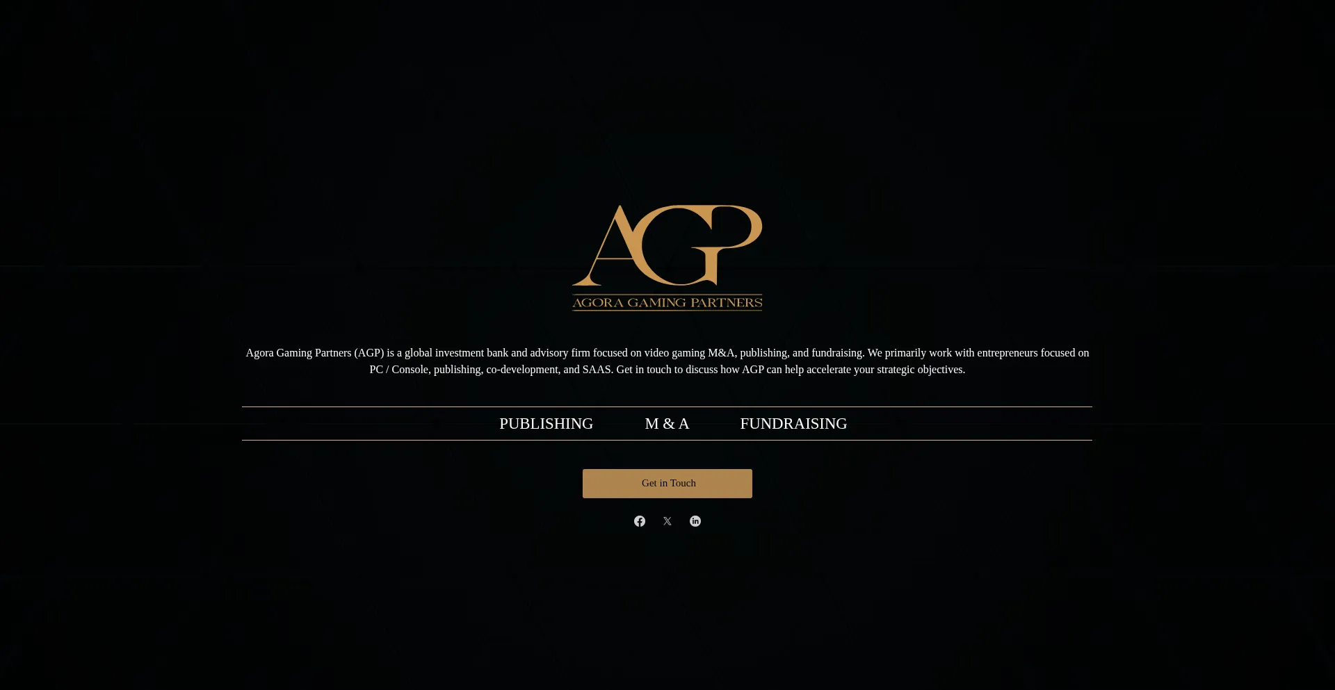 Agora Gaming Partners (AGP) is a global investment bank and advisory firm focused on video gaming M&A, publishing, and fundraising. We primarily work with entrepreneurs focused ...