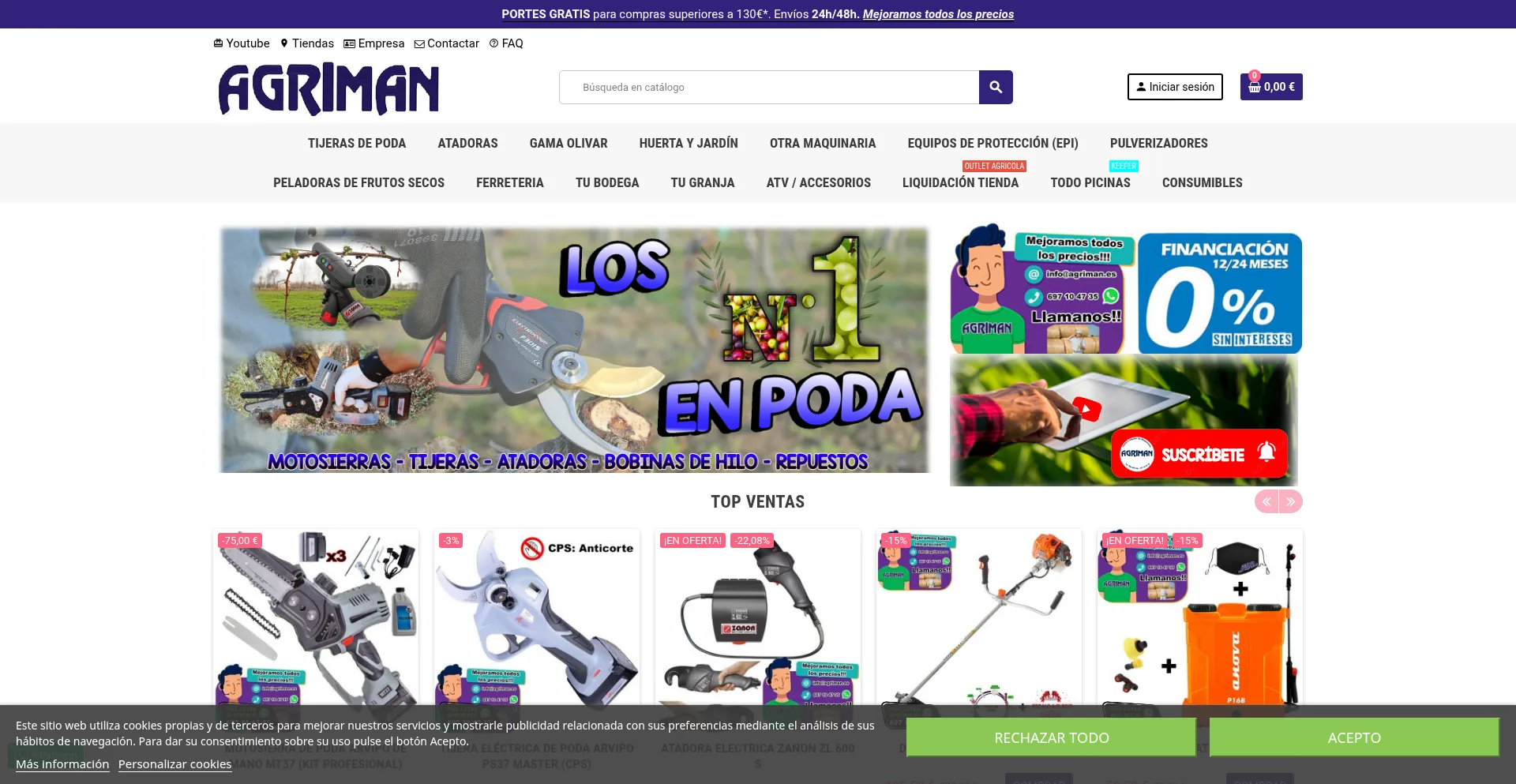 Tienda de Venta, alquiler y reparación de maquinaria agrícola, especialistas en Tijeras de poda, atadoras de viña y gama olivar. Financia todas tus compras.