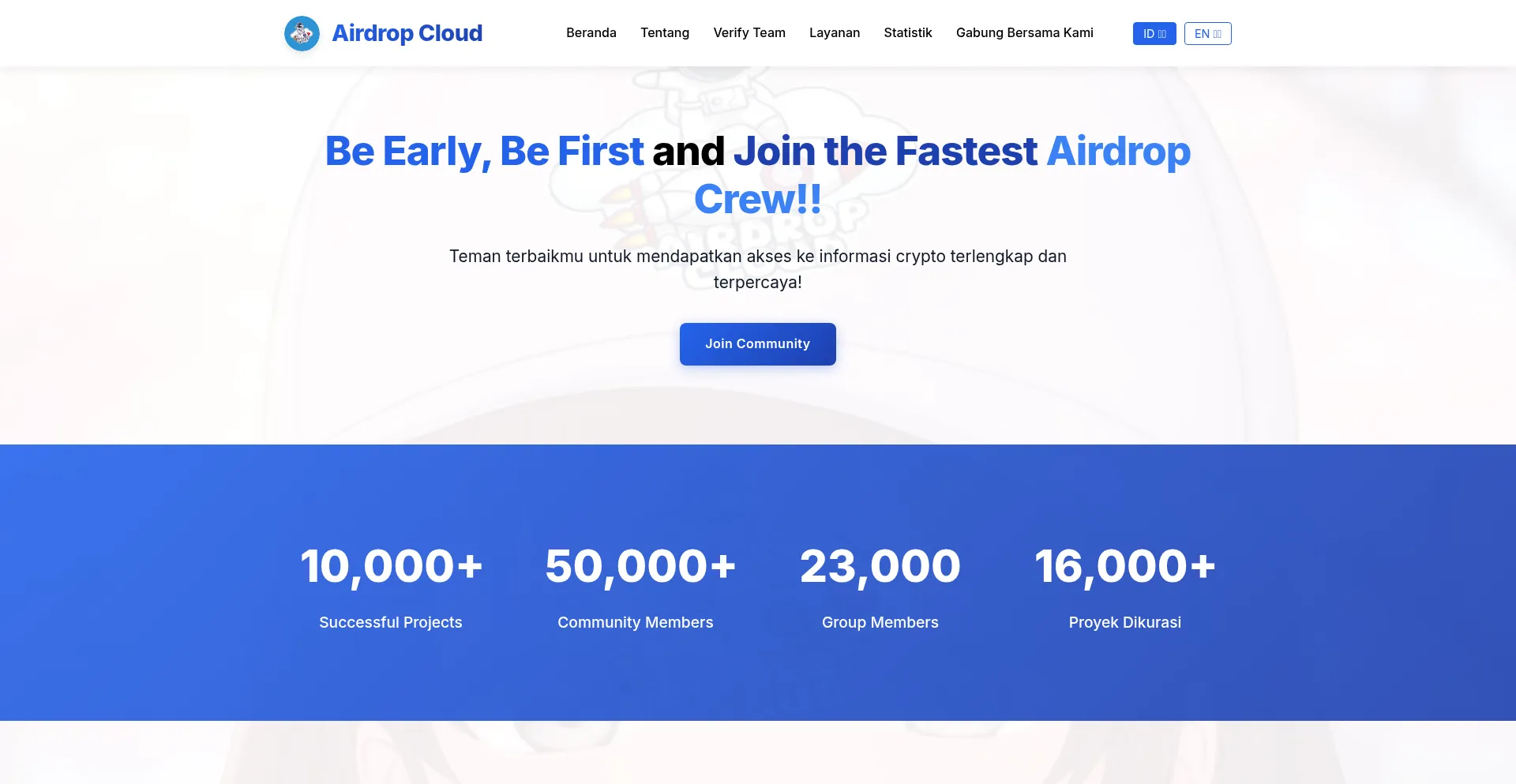 Airdrop Cloud menyajikan info airdrop crypto paling lengkap. Kami menyeleksi proyek potensial agar pemburu dan investor bisa masuk sejak awal dengan data akurat.
