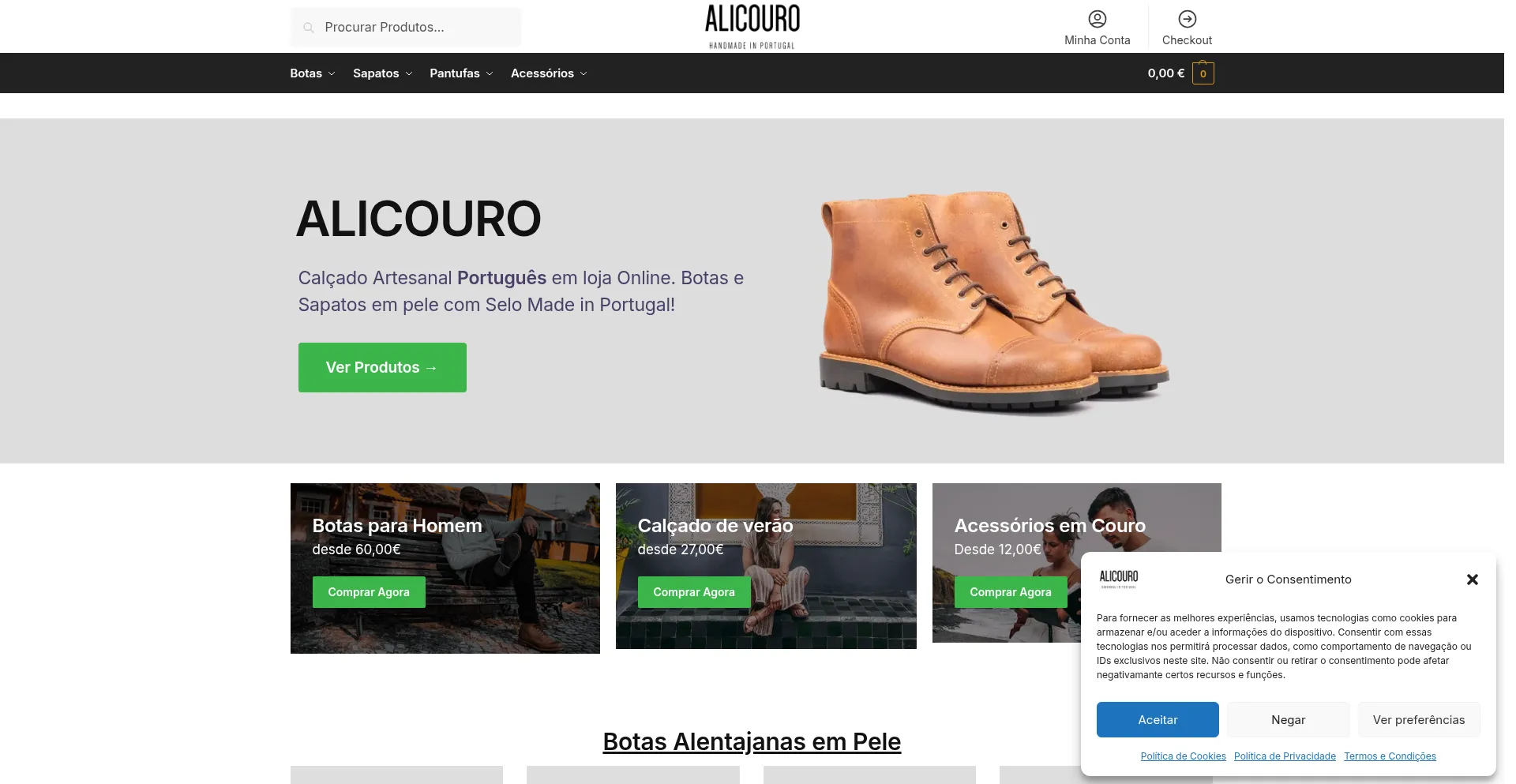 Na Alicouro encontras produtos em pele de alta qualidade, feitos Ă  mĂŁo em Portugal. Deste botas para homem, sapatos, pantufas, chinelos de verĂŁo e acessĂłrios...