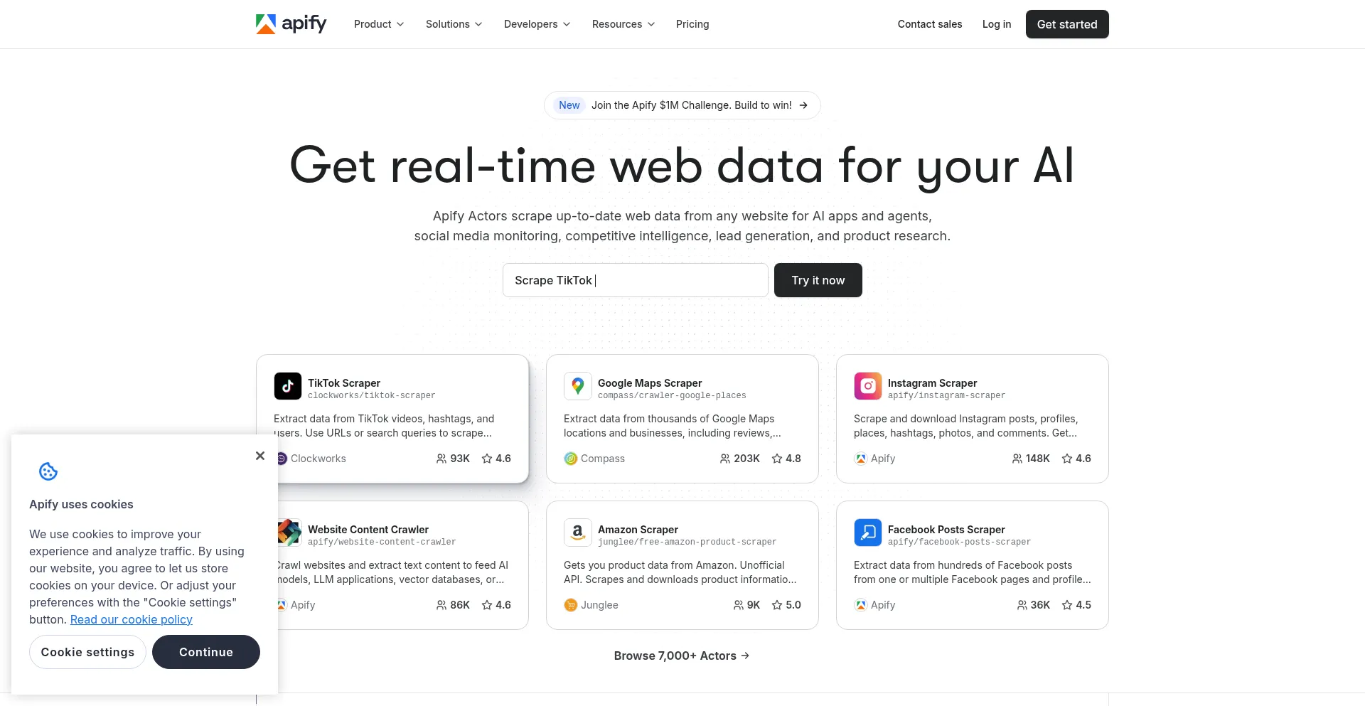 Cloud platform for web scraping, browser automation, AI agents, and data for AI. Use 7,000+ ready-made tools, code templates, or order a custom solution.