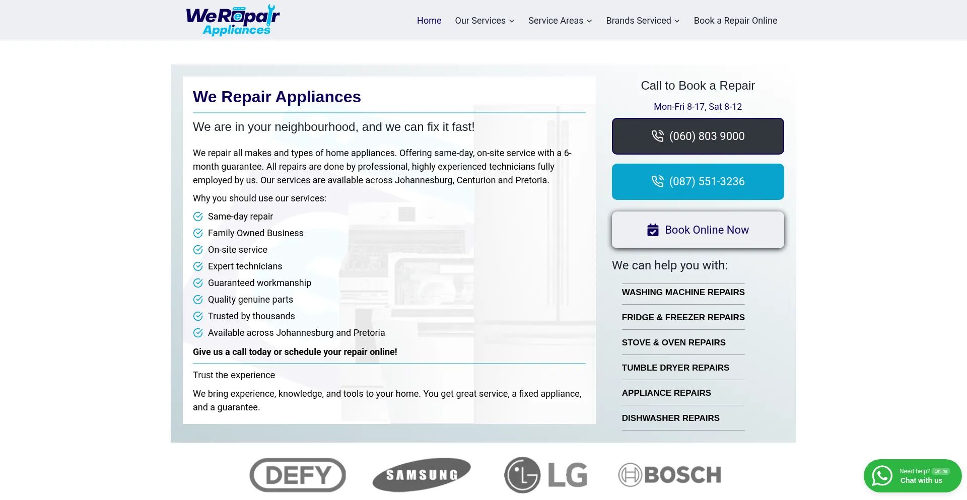 We repair all makes and types of home appliances. Offering same day, on-site service with a 6-month guarantee. All repairs are done by professional