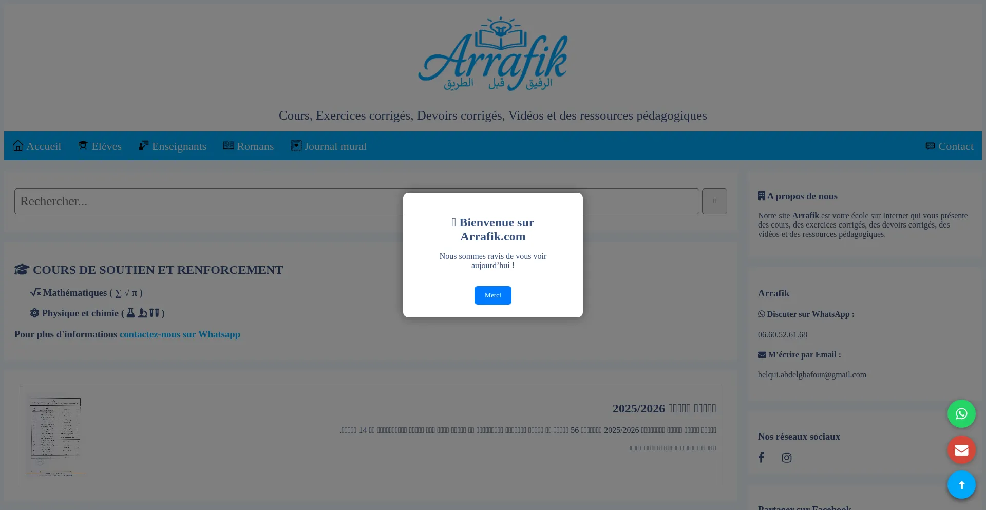 Arrafik, votre école en ligne qui met à votre disposition des cours, des exercices corrigés, des devoirs corrigés et des vidéos.