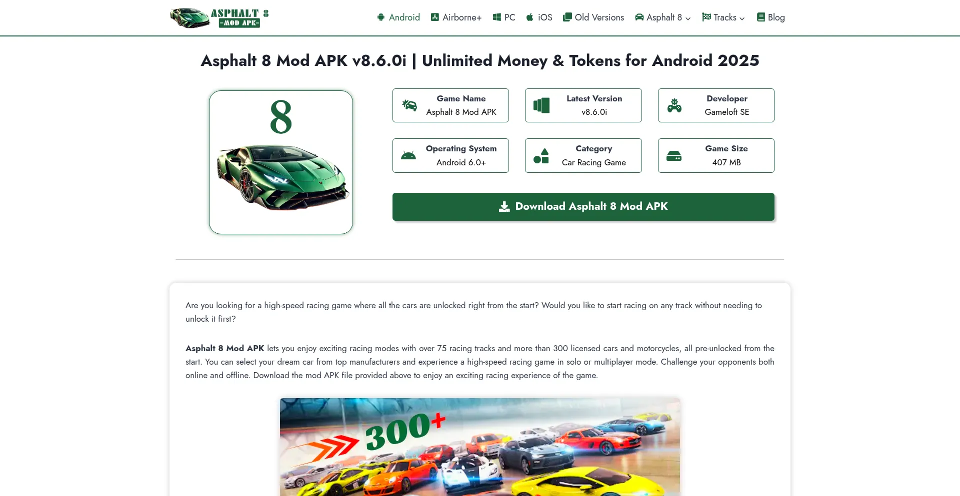 Asphalt 8 Mod APK is a high-speed racing game with 75+ tracks and 300+ cars and motorcycles fully unlocked. Enjoy the latest version on your Android phone.