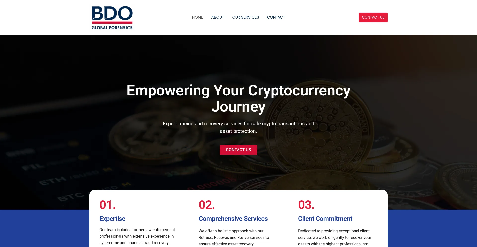 Le site web bdoglobalforensics.co annonce des services de récupération de fonds pour les actifs perdus ou volés. Tandis que certains opÚrent sur des structures d'honoraires de contingence, d'autres peuvent exiger des paiements anticipés, ce qui peut indiquer des opérations frauduleuses. Vérifiez les références et la conformité réglementaire avant d'engager de tels services.