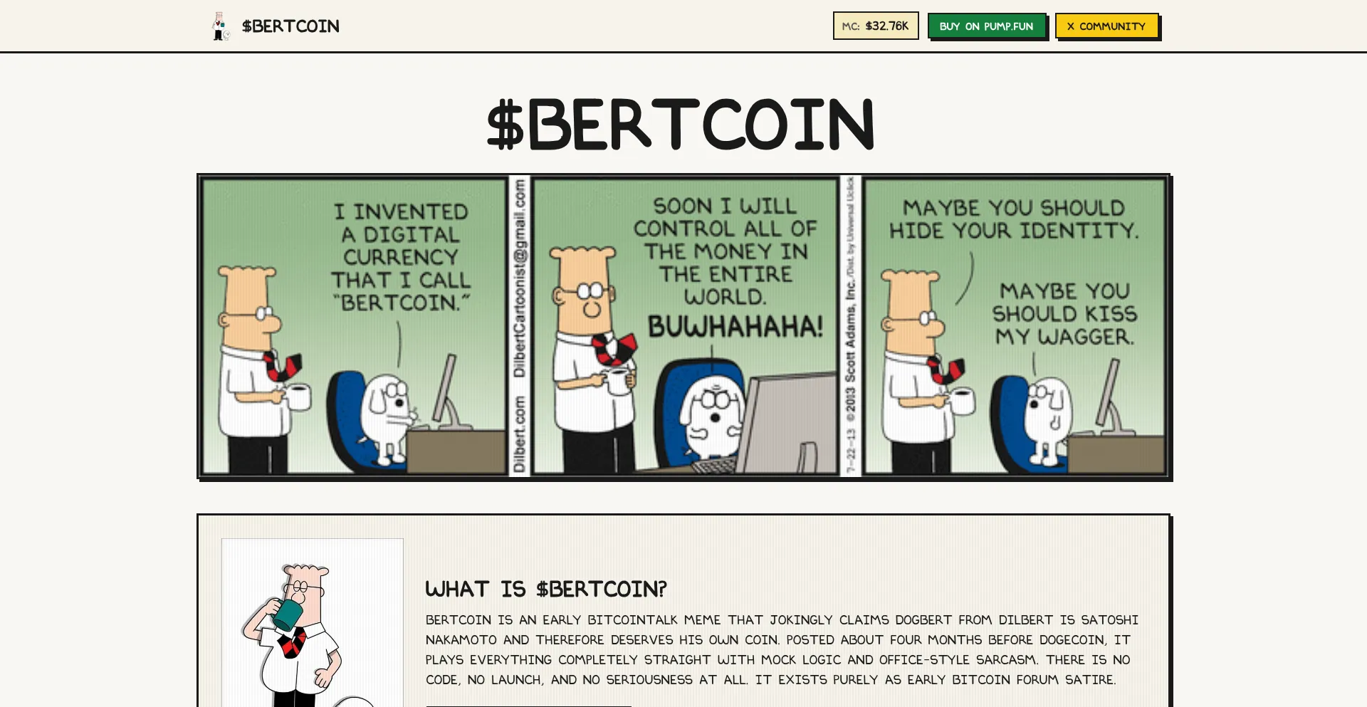 $BERTCOIN is the Dilbert-themed memecoin for everyone who's survived corporate absurdity. Join the rebellion against boring crypto on Solana.