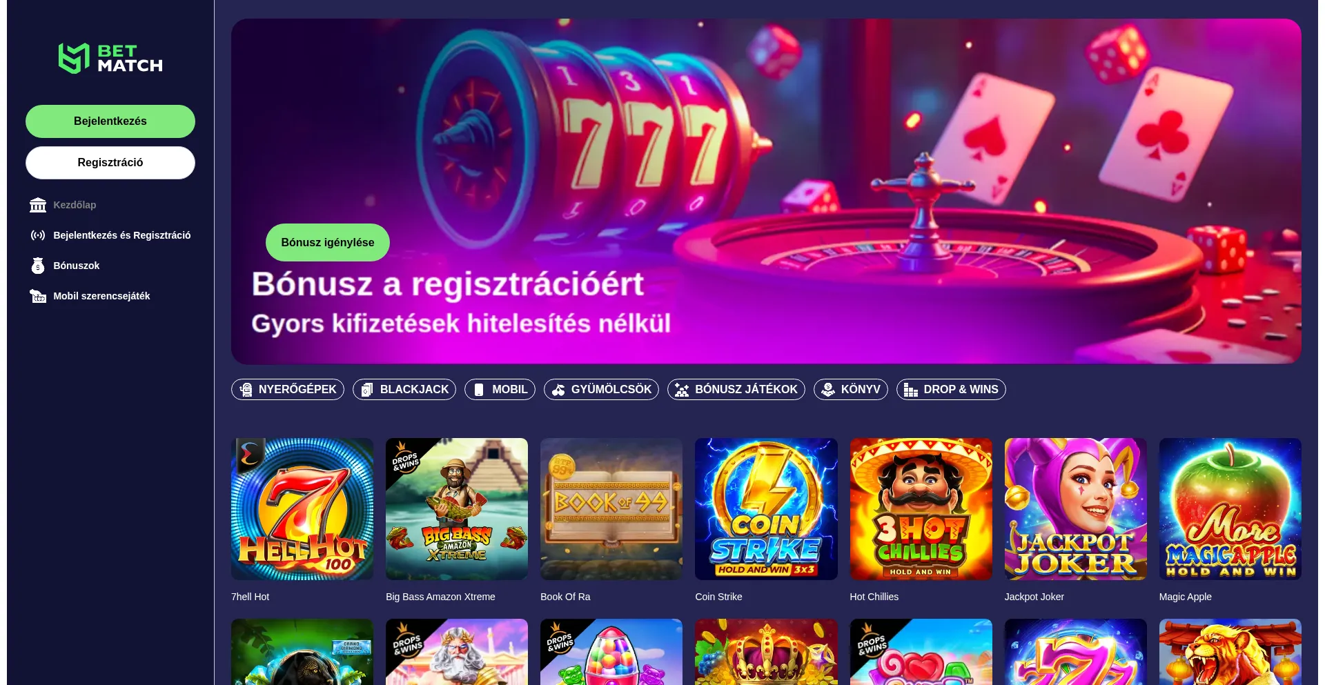 Érezd a Betmatch, MagyarorszĂĄg kedvenc kaszinĂłjĂĄnak lĂŒktetĂ©sĂ©t! Pörgesd meg az ikonikus nyerƑgĂ©peket, hĂłdĂ­tsd meg az Ă©lƑ asztalokat, Ă©s vegyĂ©l igĂ©nybe exkluzĂ­v...