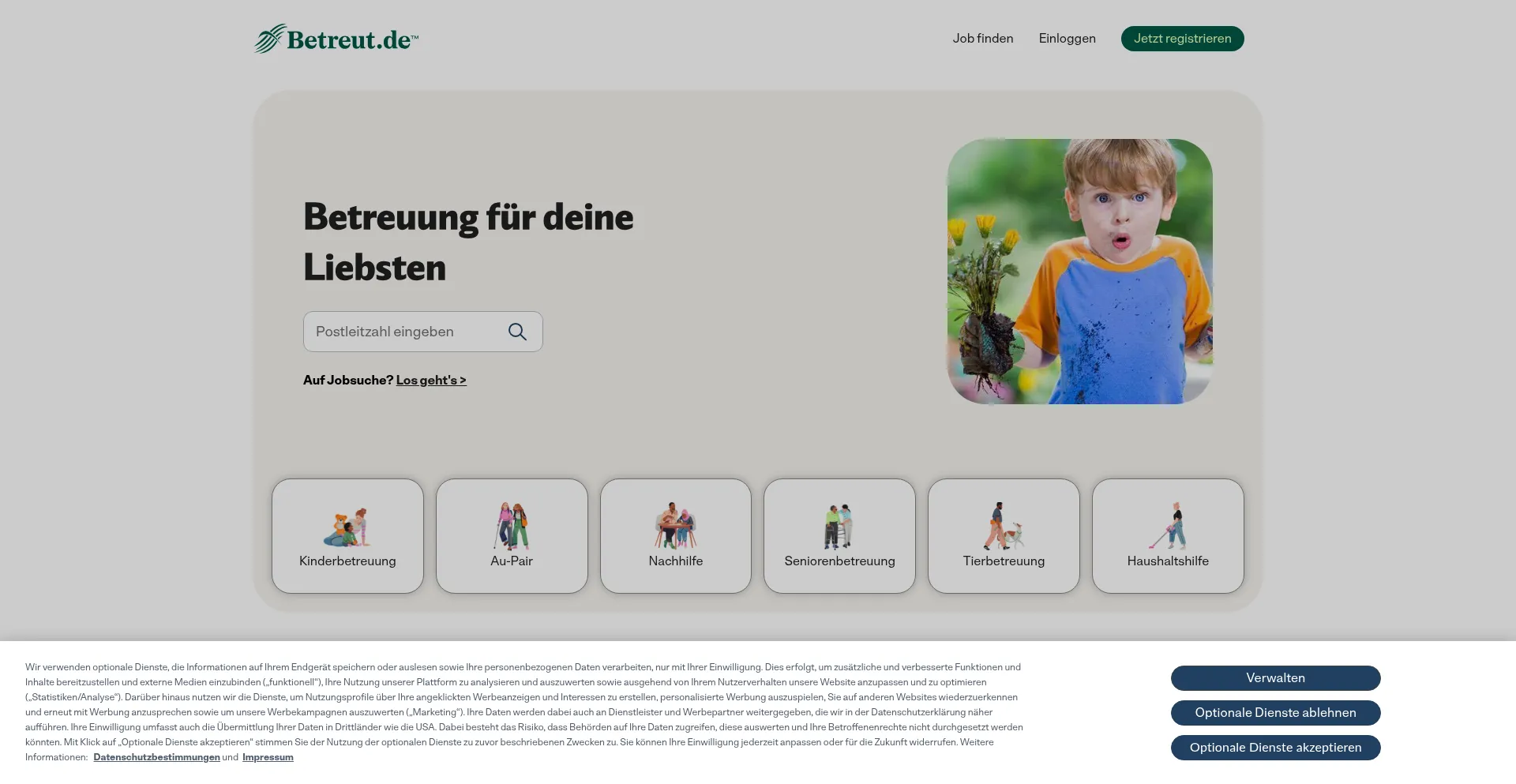 Betreuung jeder Art und Alltagshelfer auf Betreut.de finden! Zahlreiche Angebote & Jobs in Ihrer Nachbarschaft fĂŒr Babysitten, Haushaltshilfe, Tiersitter & mehr