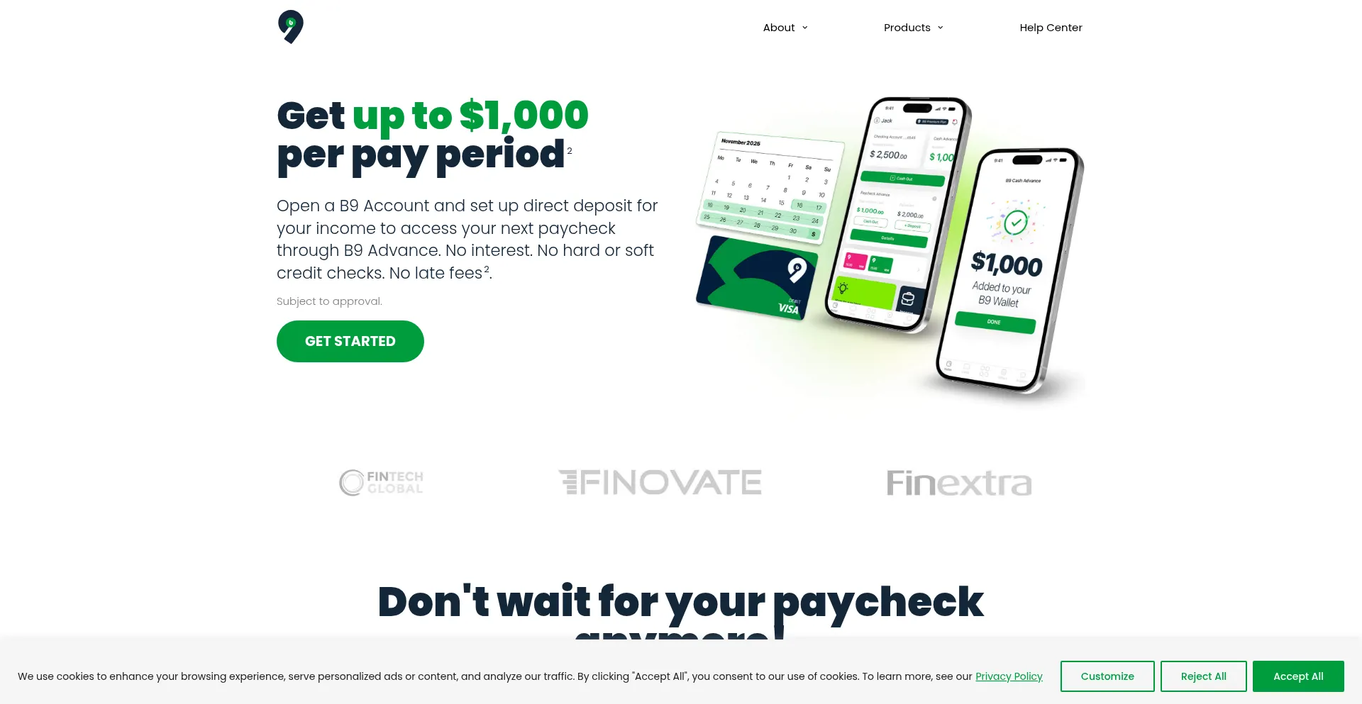 B9 is an app that gives you early access to up to $1,000 of your paycheck per pay period. B9 VisaÂź Debit Card With up to 5 % cashback included.