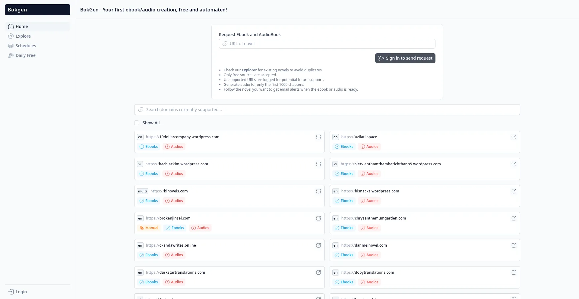 Create your first ebook or audio for free with BokGen! Automate from public domain novels, MOBI, PDF, EPUB, AZW3 files. Download free novel ebooks easily.