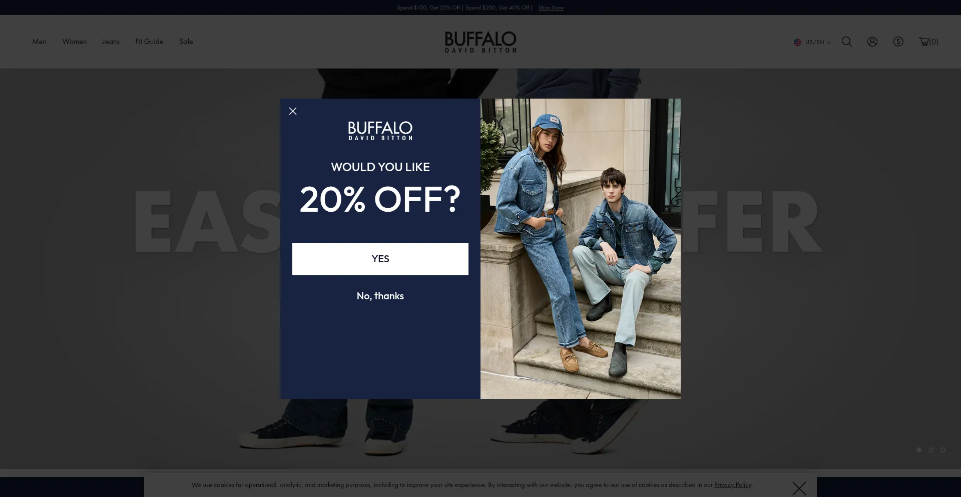Le site web implémente des mécanismes de consentement aux cookies en conformité avec les réglementations de confidentialité telles que RGPD ou CCPA. Cela démontre que buffalojeans.com adhÚre aux standards de protection des données et fournit aux utilisateurs un contrÎle sur les pratiques de collecte de données personnelles.