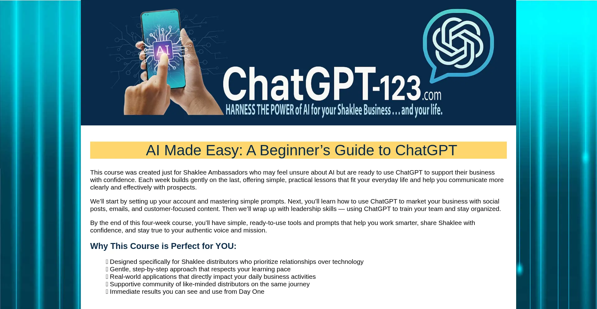 This course was created just for Shaklee Ambassadors who may feel unsure about AI but are ready to use ChatGPT to support their business with confidence.