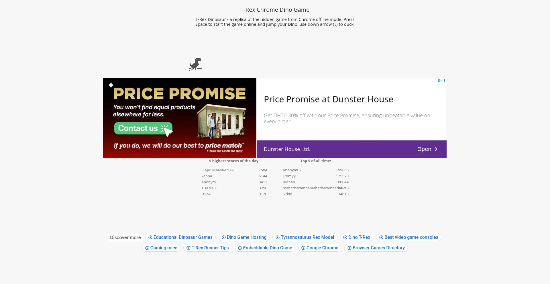 T-Rex Dinosaur - a replica of the hidden game from Chrome offline mode. Press Space to start the game online and jump your Dino, use down arrow (↓) to duck.