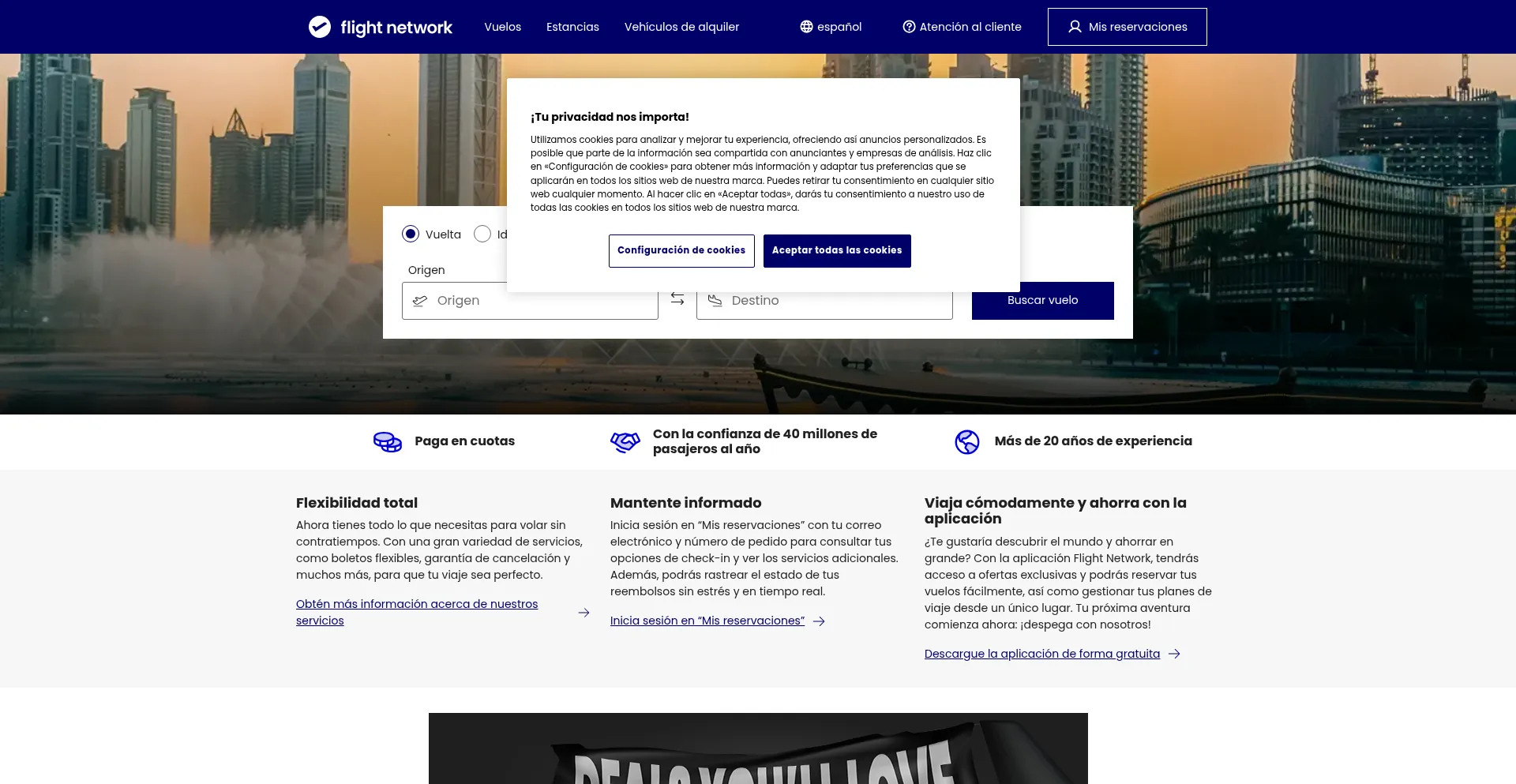 PĂĄgina de inicio de Flight Network: increĂ­bles vuelos para viajar con comodidad