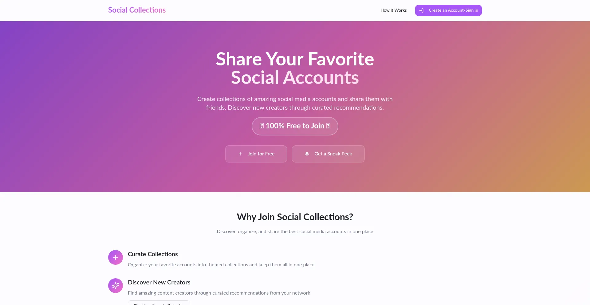 Create and share collections of your favorite social media accounts with friends. Discover new creators through curated recommendations from the community.
