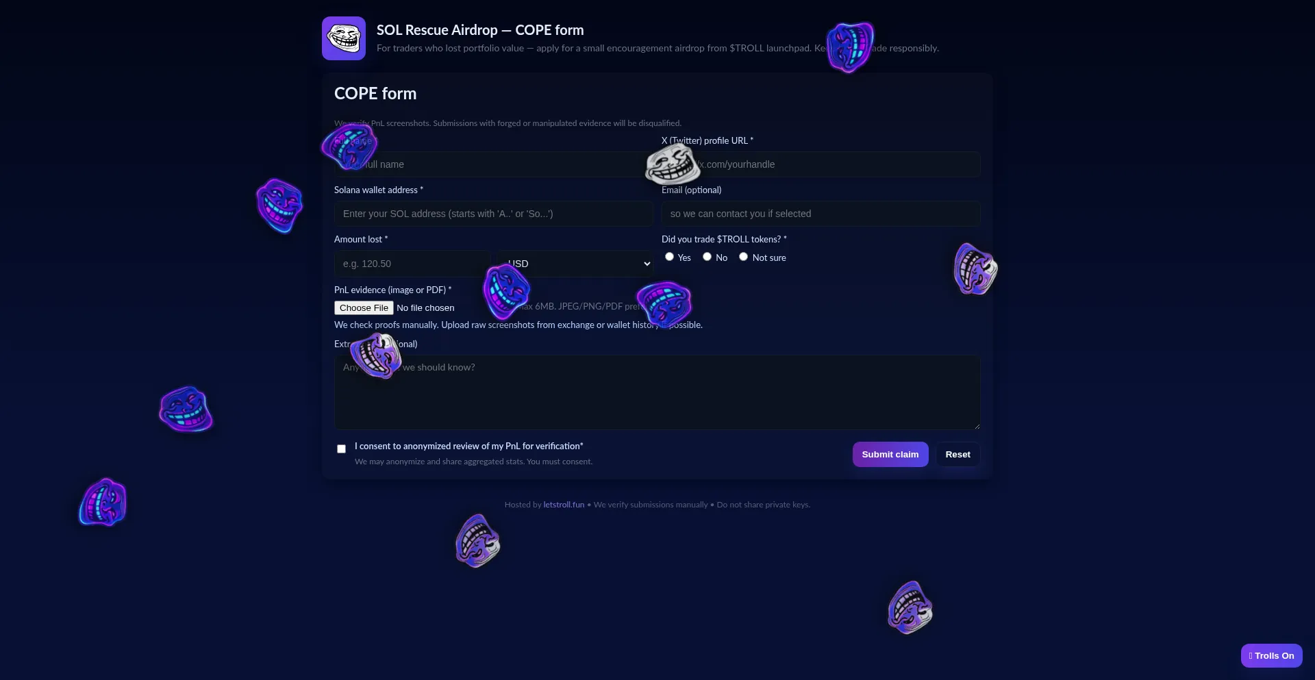 For traders who lost portfolio value — apply for a small encouragement airdrop from $TROLL launchpad.