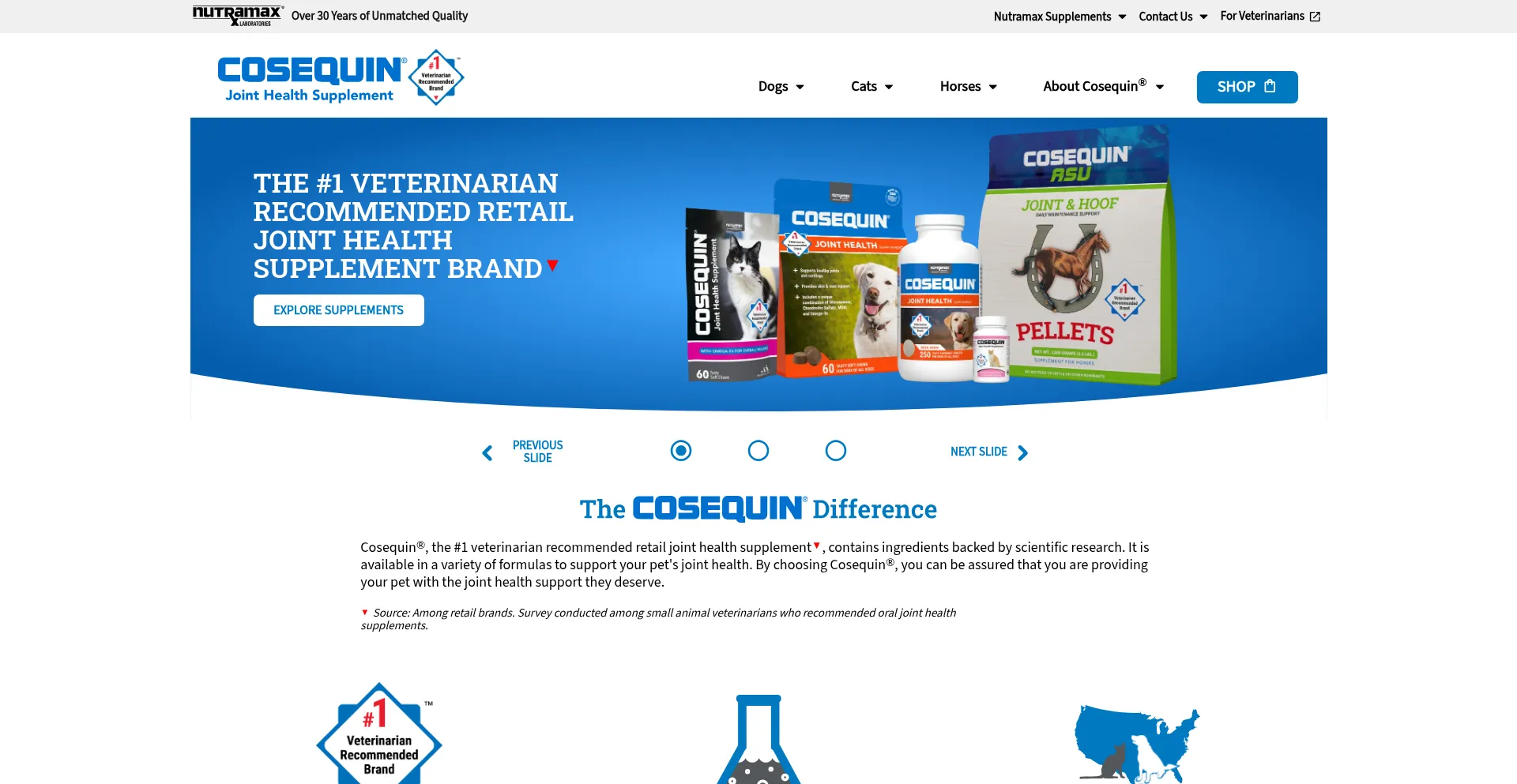 CosequinÂź, the #1 veterinarian recommended joint supplement brand, has supplements in a variety of formulas to meet the specific needs of your dog, cat or horse.