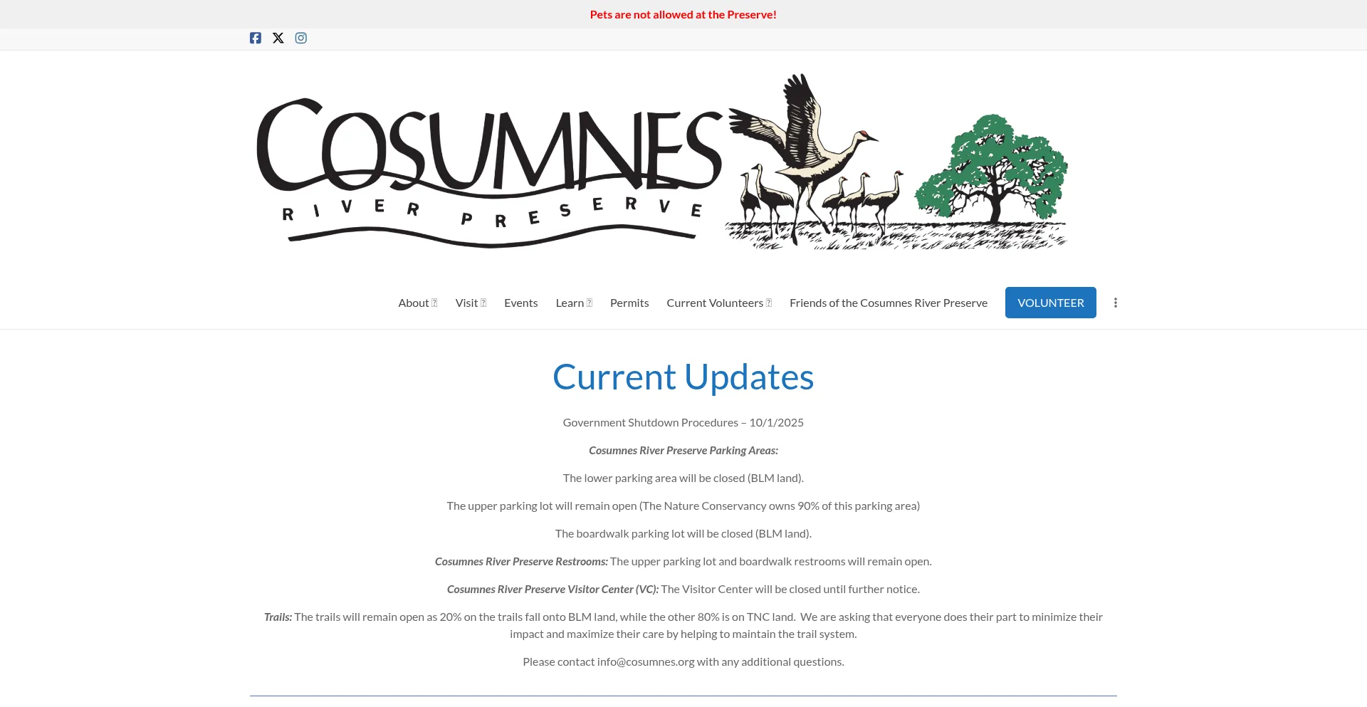 Current Updates Government Shutdown Procedures - 10/1/2025 Cosumnes River Preserve Parking Areas: The lower parking area will be closed (BLM land). The upper parking lot will re...