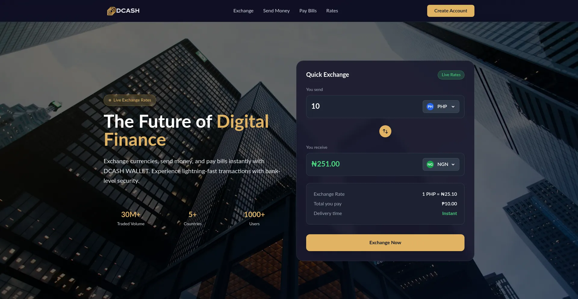 Exchange currencies, send money, and pay bills instantly with DCASH WALLET.
