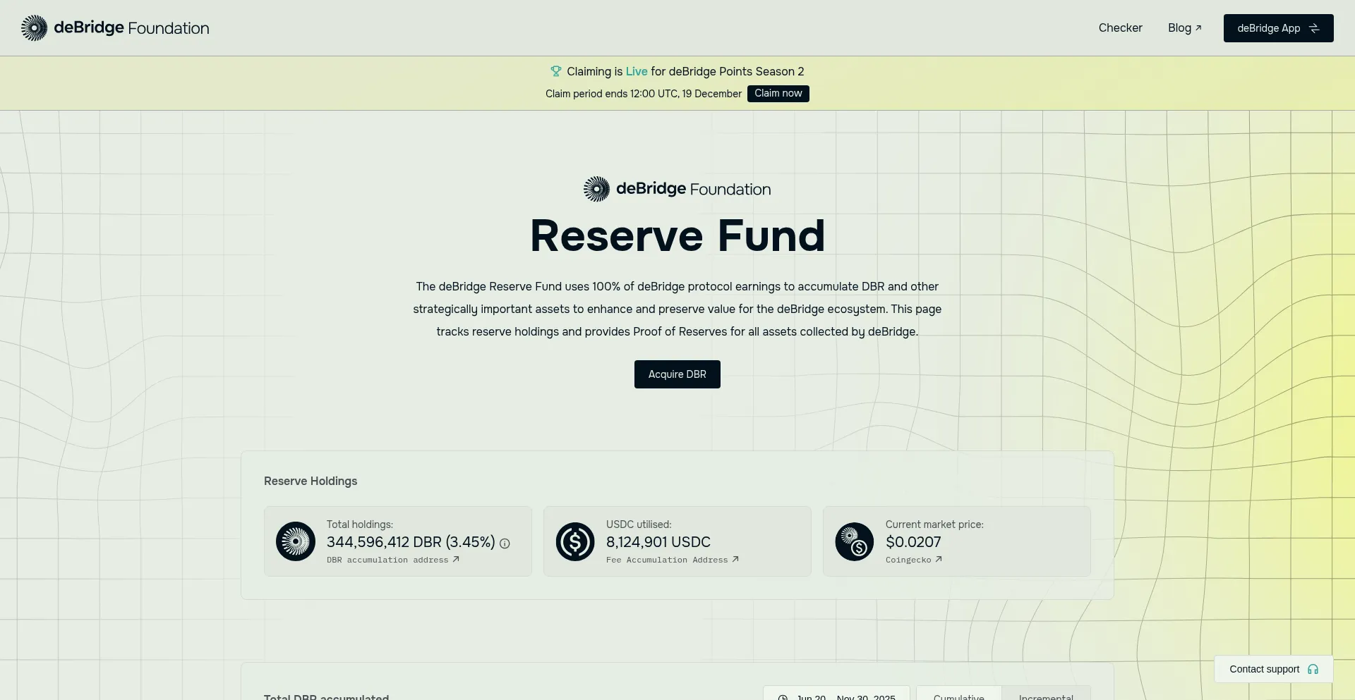 Track the deBridge Reserve Fund in real time. View token holdings, fund allocations, and onchain activity across DBR, USDC, SOL, and ETH.