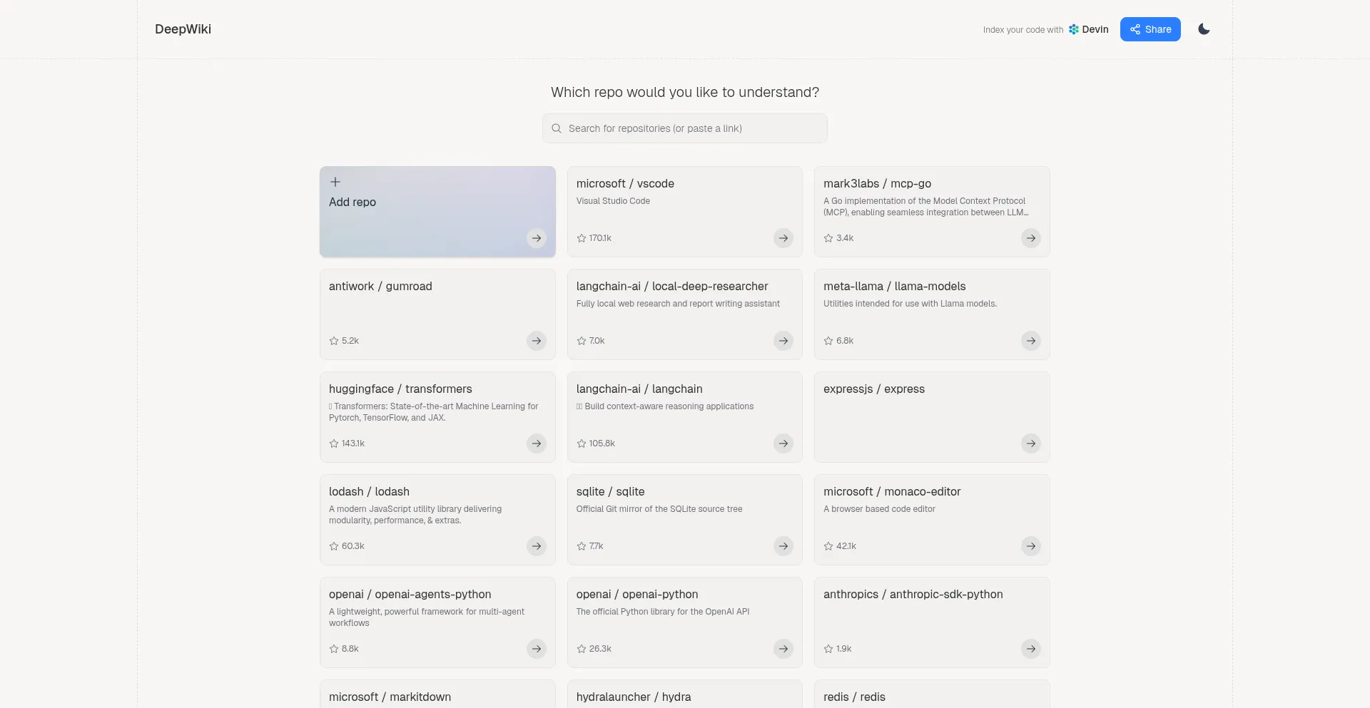 DeepWiki provides up-to-date documentation you can talk to, for every repo in the world. Think Deep Research for GitHub - powered by Devin.