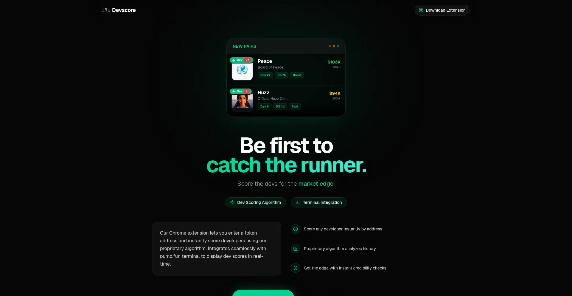 Chrome extension that scores crypto developers using proprietary algorithms. Get real-time dev scores in pump.fun terminal for smarter trading decisions.