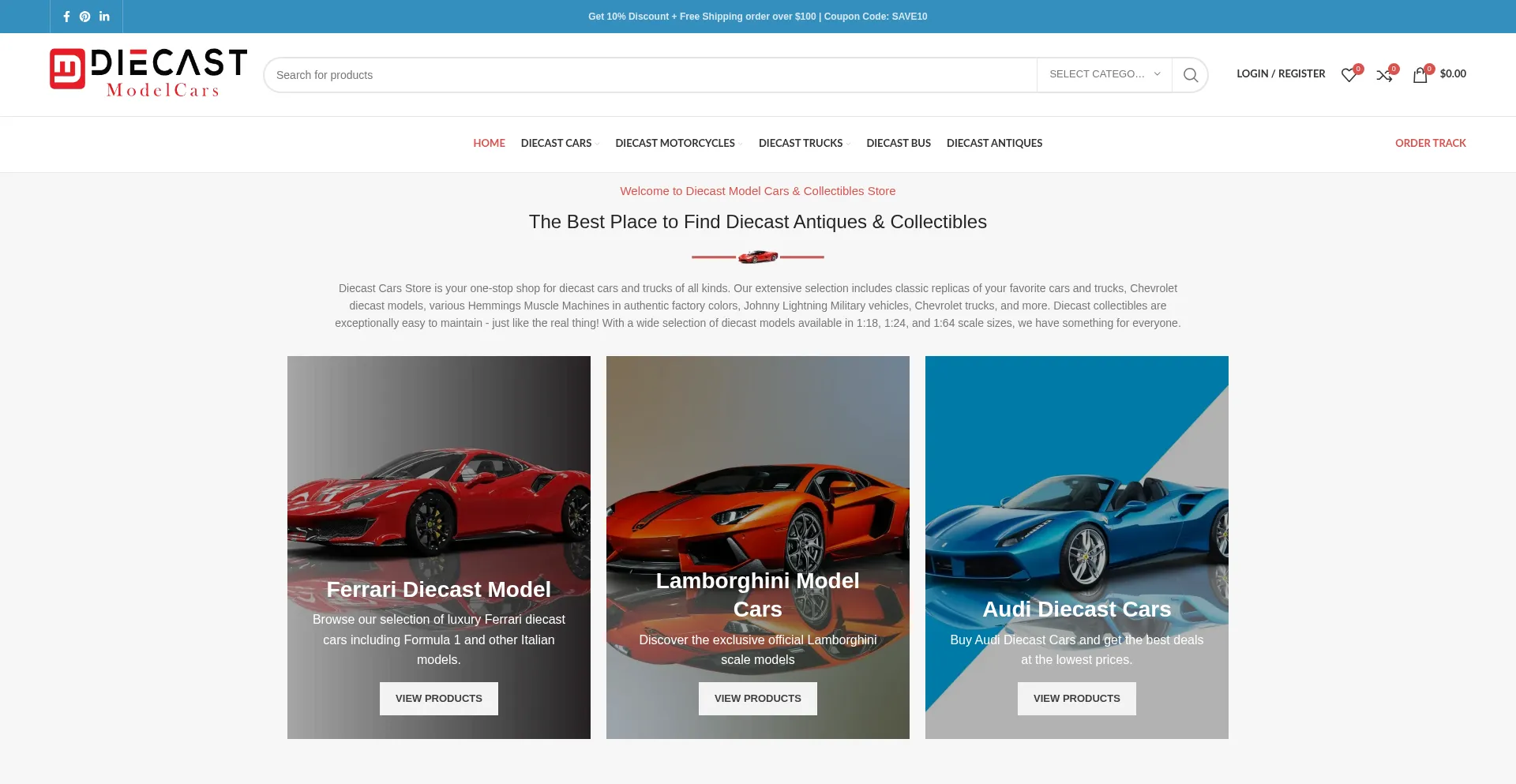 Diecast Cars Store is the leading online retailer of diecast collectibles. We carry many classic replicas of your favorite cars and trucks in 1:18, 1:24, and 1:64 scale sizes. O...
