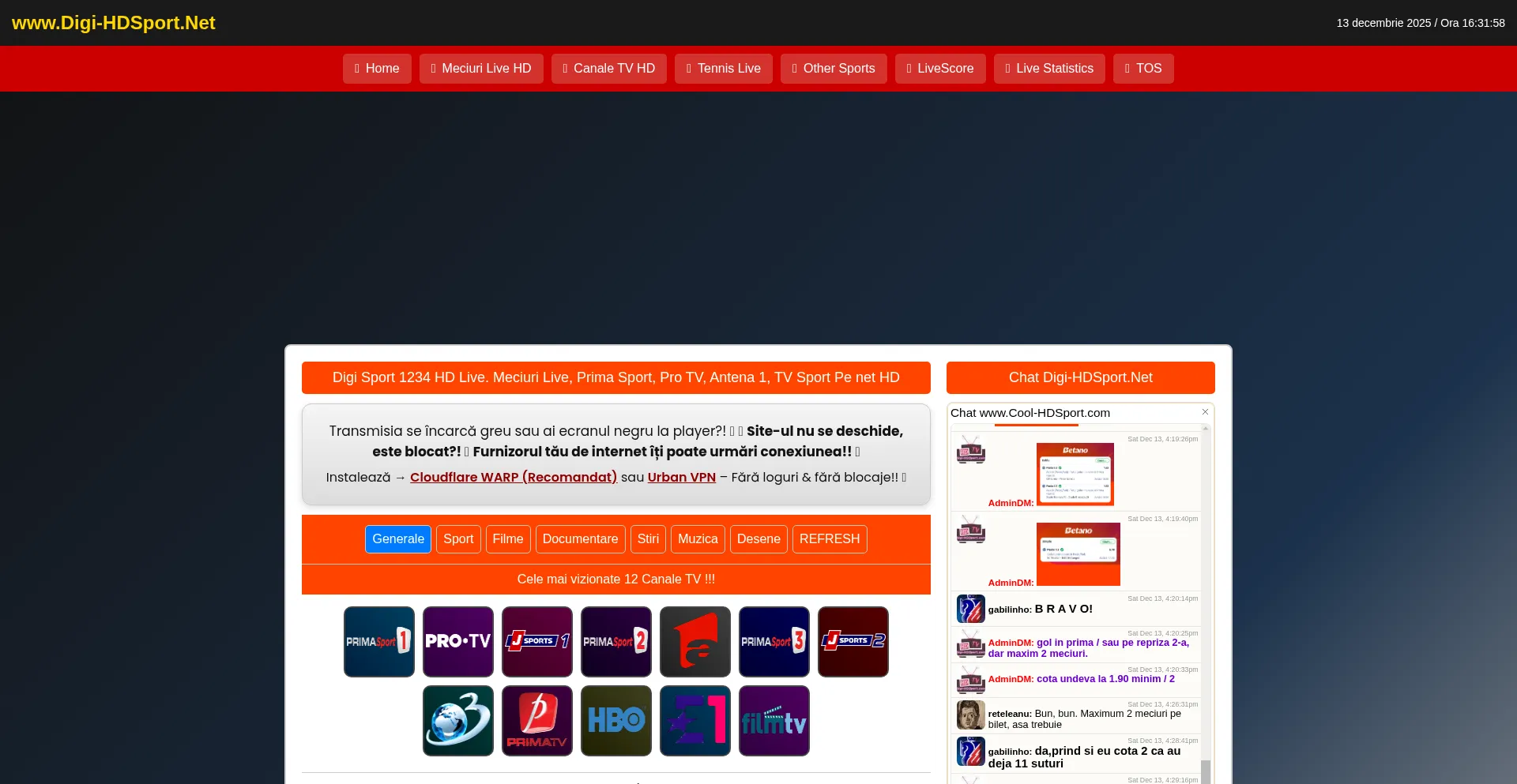 Digi Sport 1234 HD Live. Meciuri Live HD, Prima Sport HD, Pro TV, Antena 1 HD Online, TV Sport Pe net HD, Posturi TV Online