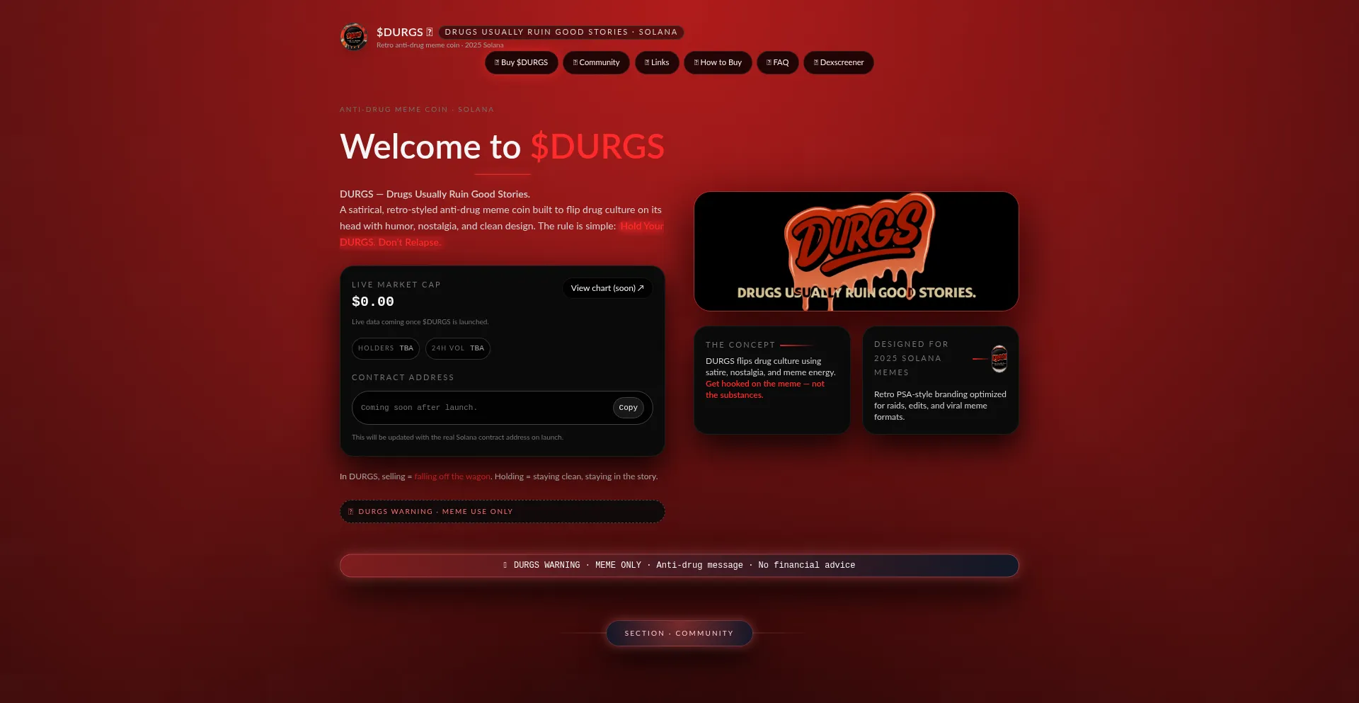 DURGS — Drugs Usually Ruin Good Stories. Anti-drug meme coin on Solana with retro DARE energy. Get hooked on the meme, not the substances.