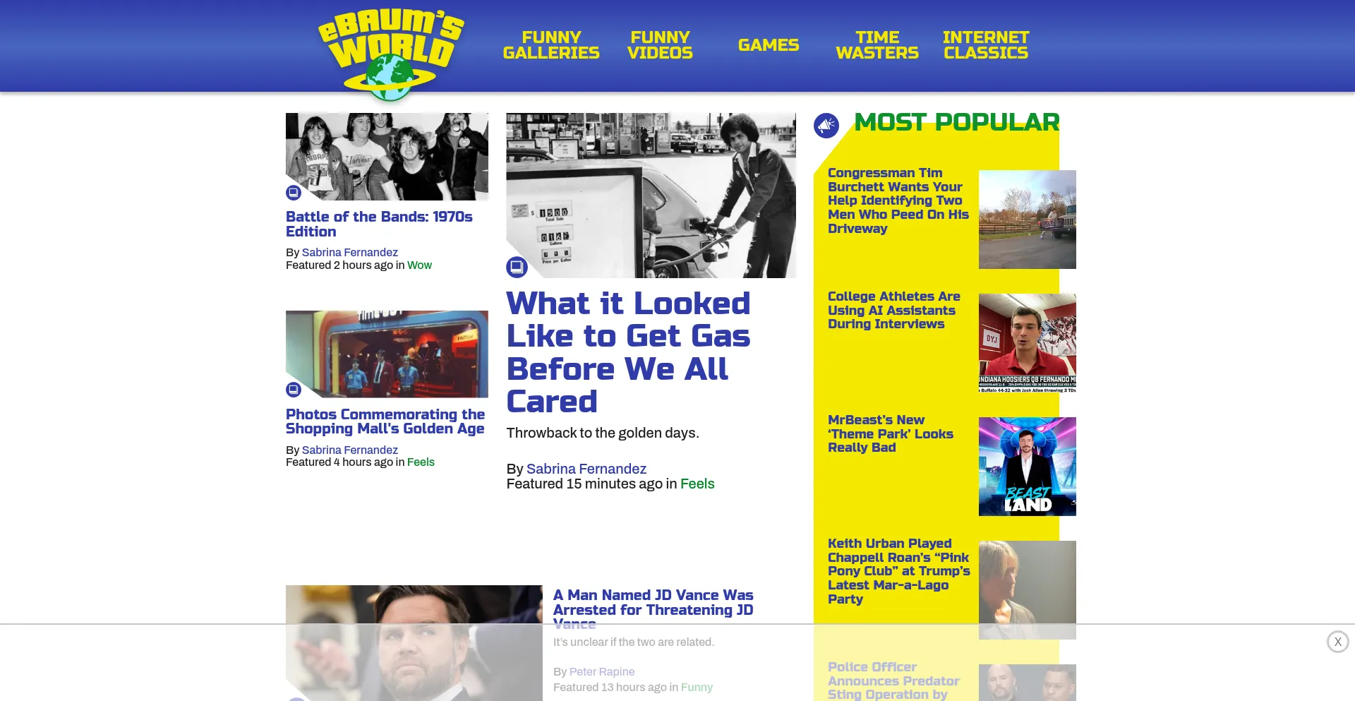 A nonchalant collection of funny pictures, slightly-dank memes, and somewhat crazy videos that eBaum's World users uploaded from all over the internet from dashcams, the deep we...
