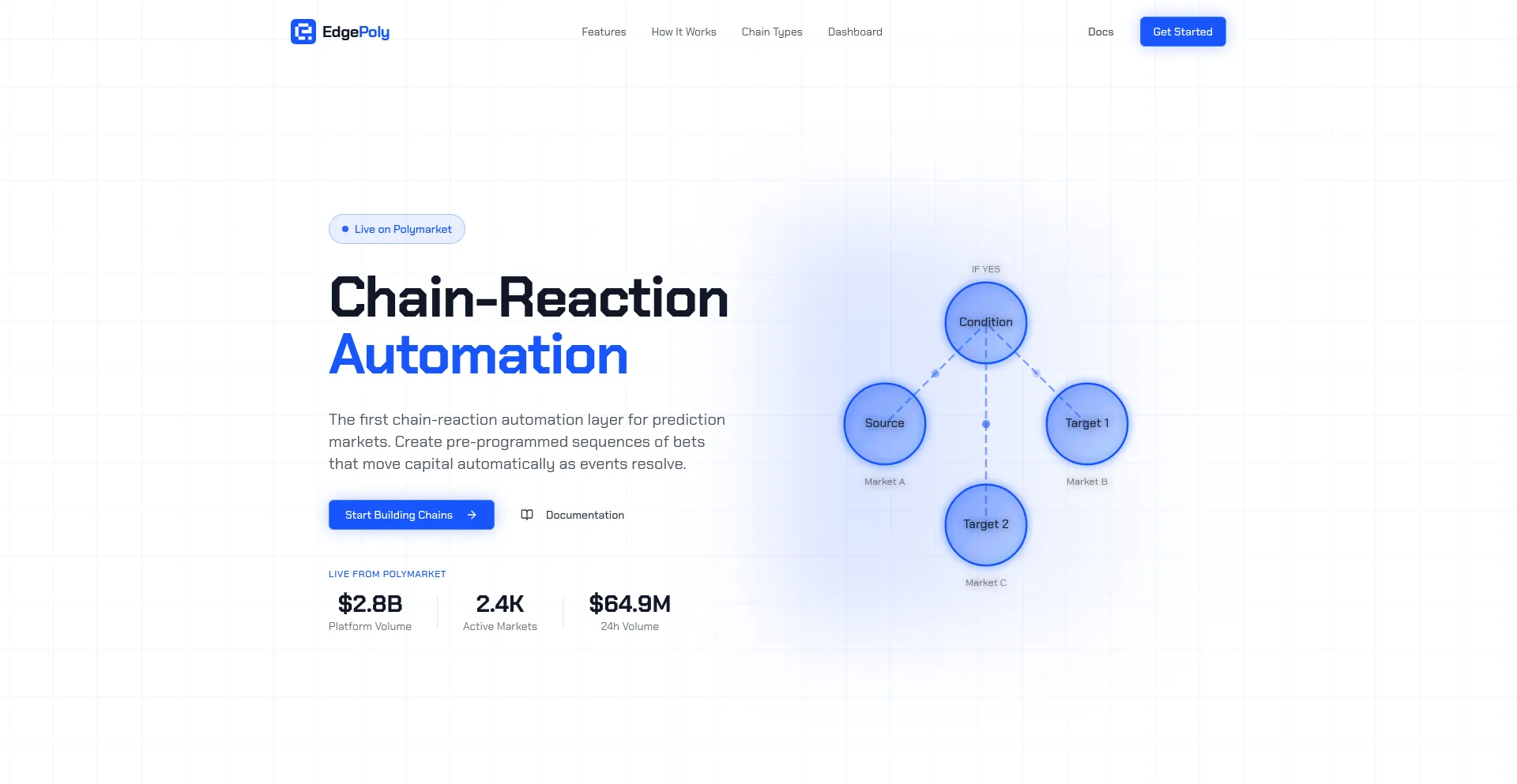 EdgePoly is the first chain-reaction automation layer for prediction markets. Create pre-programmed sequences of bets that move capital automatically as events resolve.