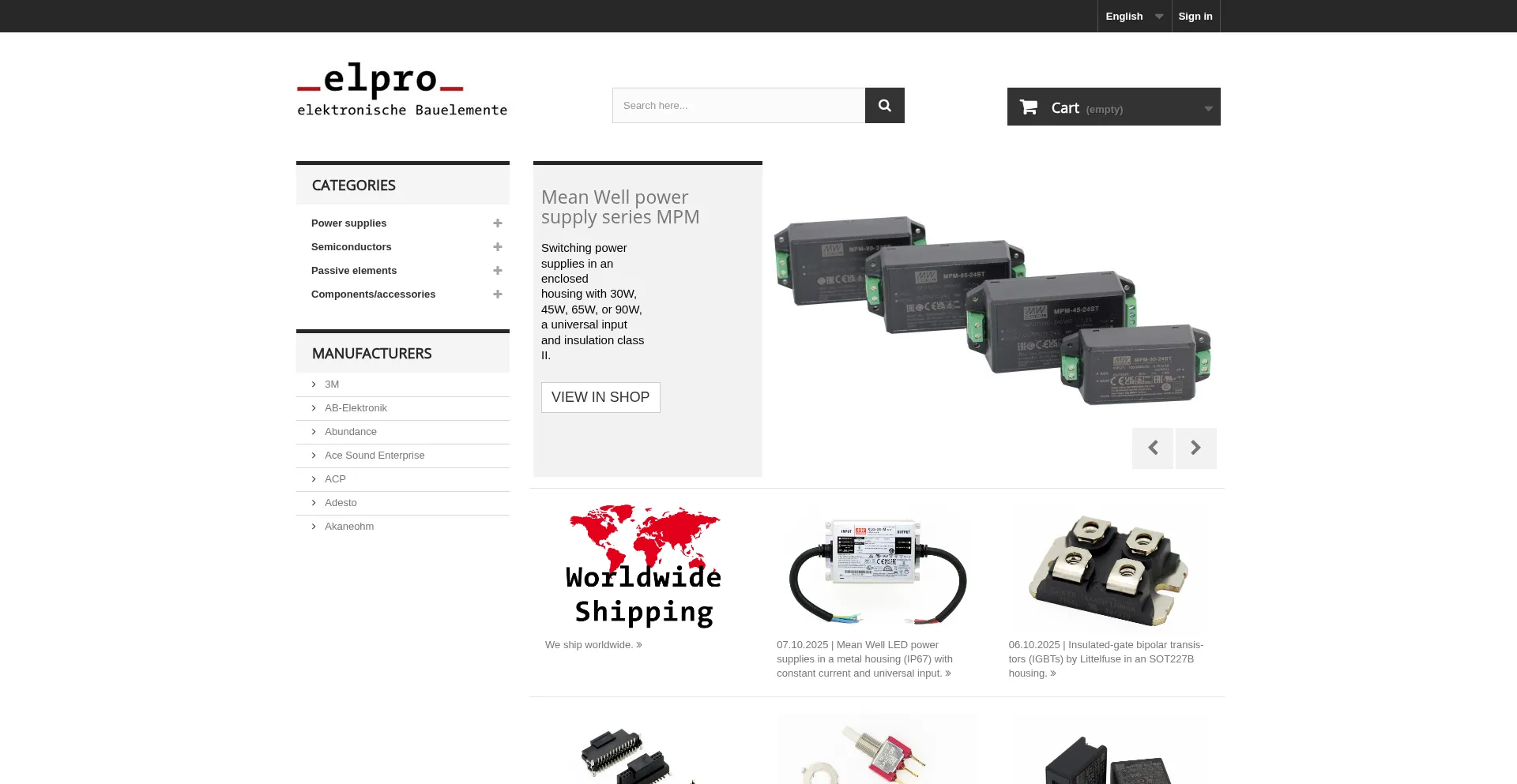Distribution of electronic components such as Mean Well power supplies, passive or active components from renowned manufacturers and mechanical components via our online shop.