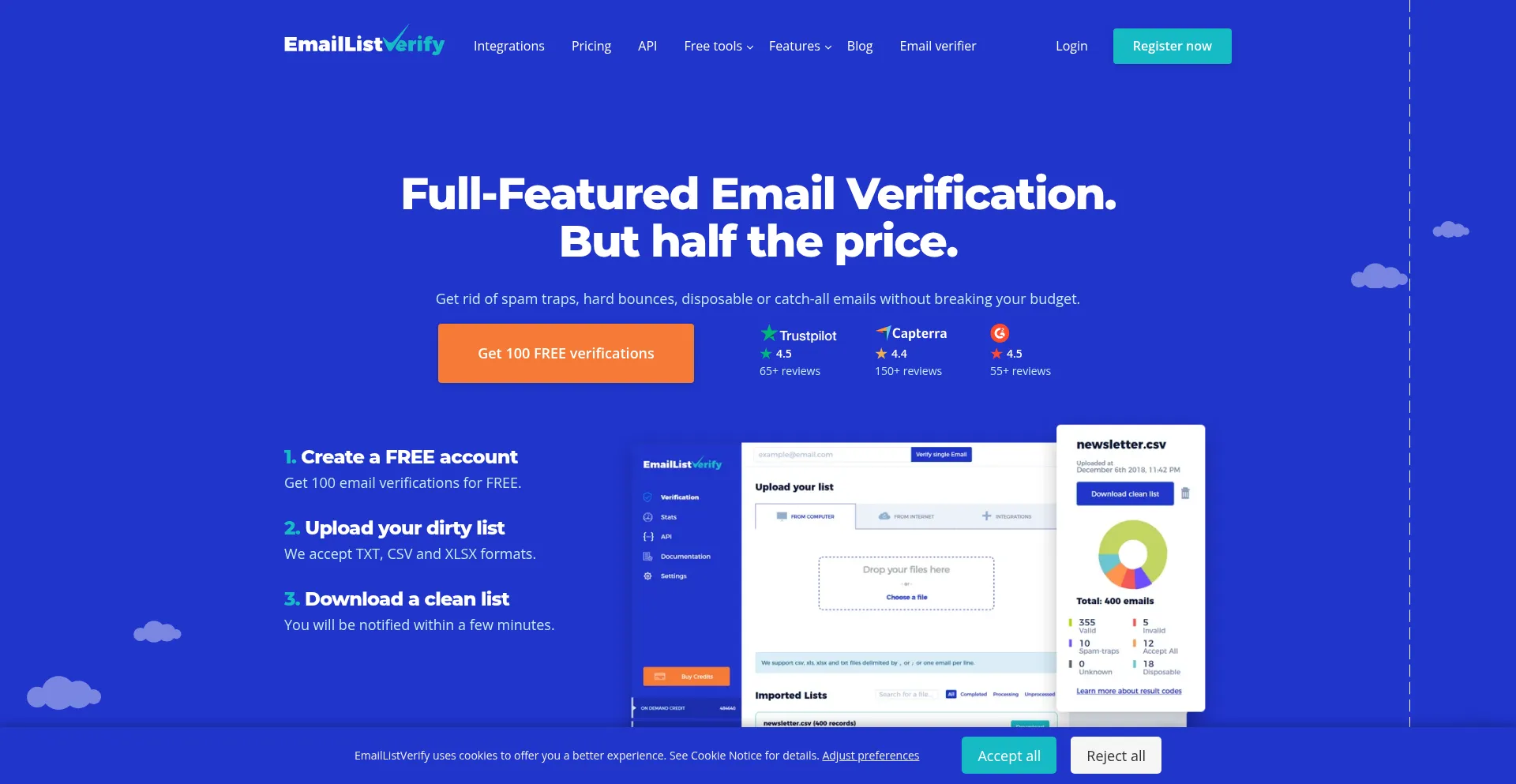 Get rid of spam traps, bounces, disposable or catch-all emails with bulk email verifier or real-time API. Start with 100 FREE email verifications!