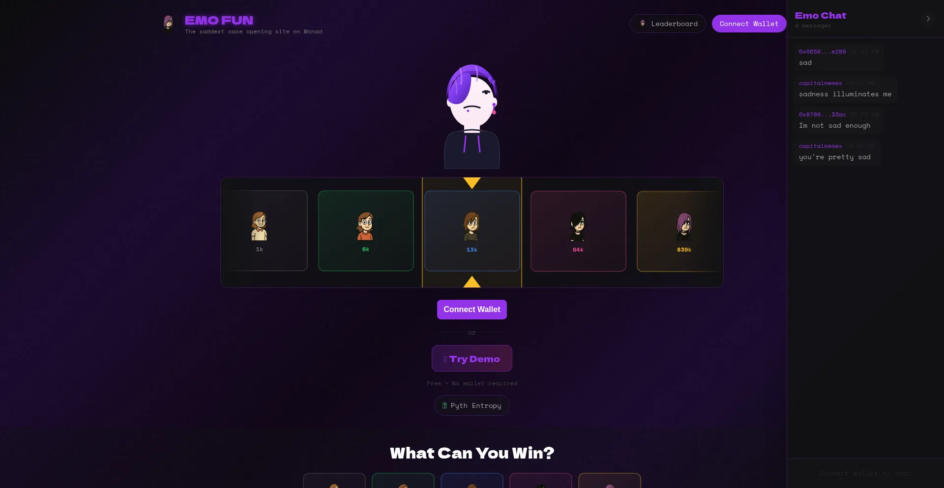 Open cases, win EMO. The most emo way to gamble on Monad.