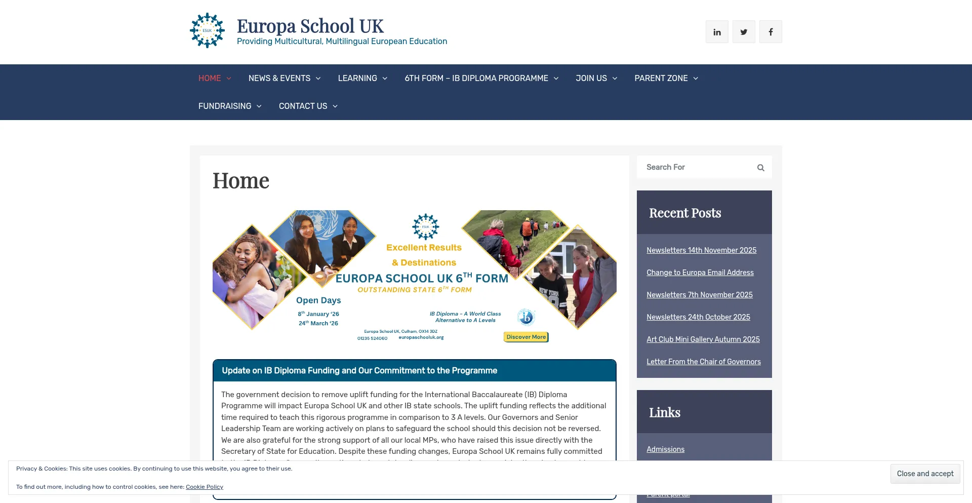 La présence de liens de médias sociaux sur le site web indique que europaschooluk.org maintient des comptes officiels sur les médias sociaux, ce qui est un signe positif de crédibilité et d'engagement.