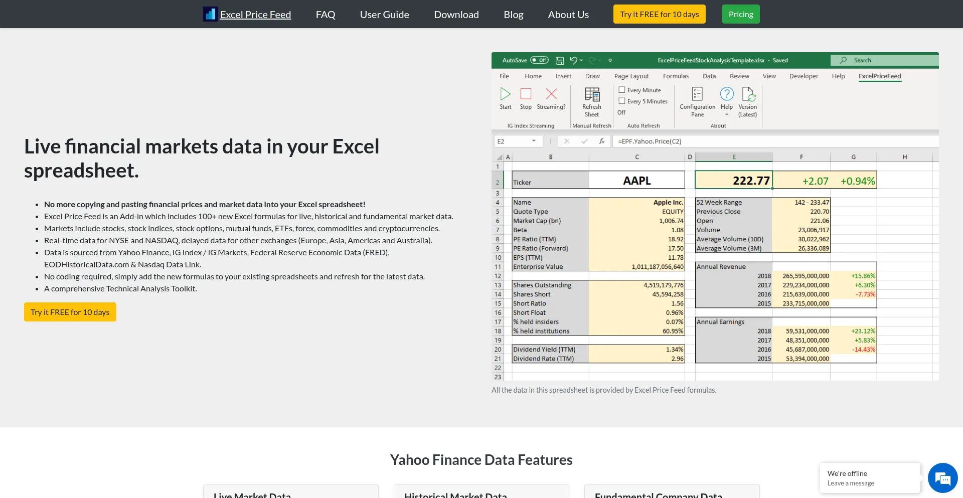 An Excel Add-in / Plug-in which provides live, historic and fundamental market data as well as a technical analysis toolkit for your Excel spreadsheet. Currently connects to Yah...