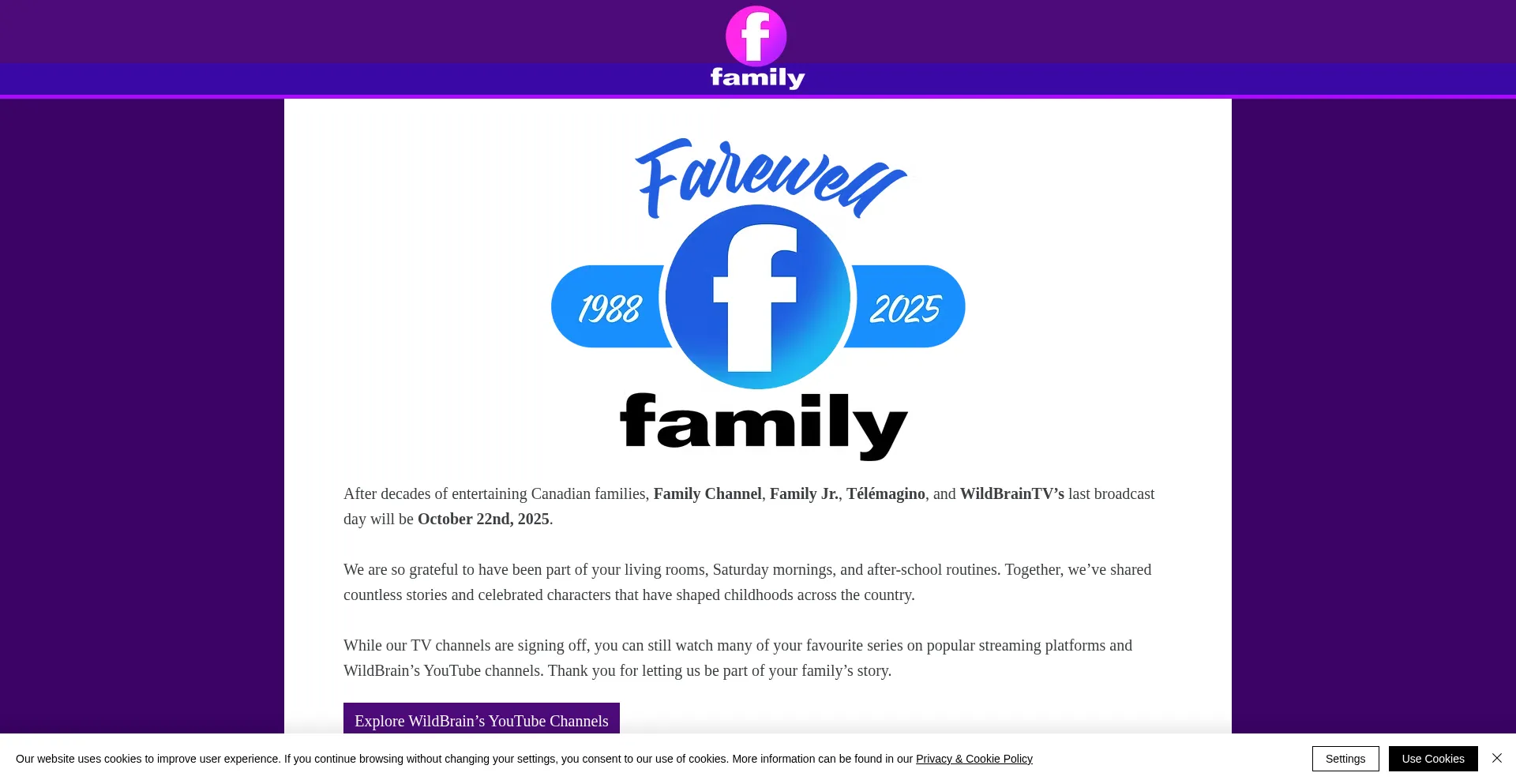 After decades of entertaining Canadian families, Family Channel, Family Jr., TĂ©lĂ©magino, and WildBrainTV’s last broadcast day will be October 22nd, 2025.