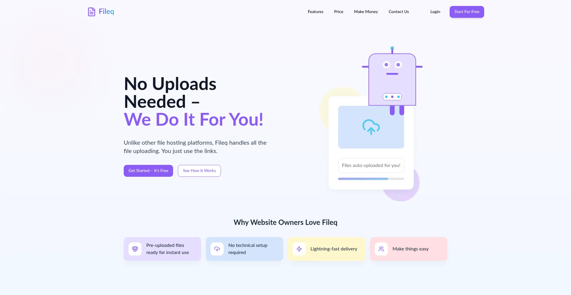Unlike other file hosting platforms, Fileq handles all the file uploading.