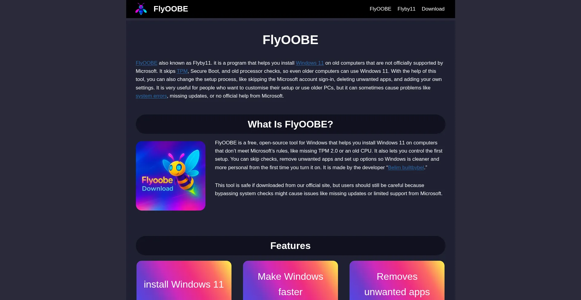FlyOOBE also known as Flyby11. it is a program that helps you install Windows 11 on old computers that are not officially supported by Microsoft. It skips