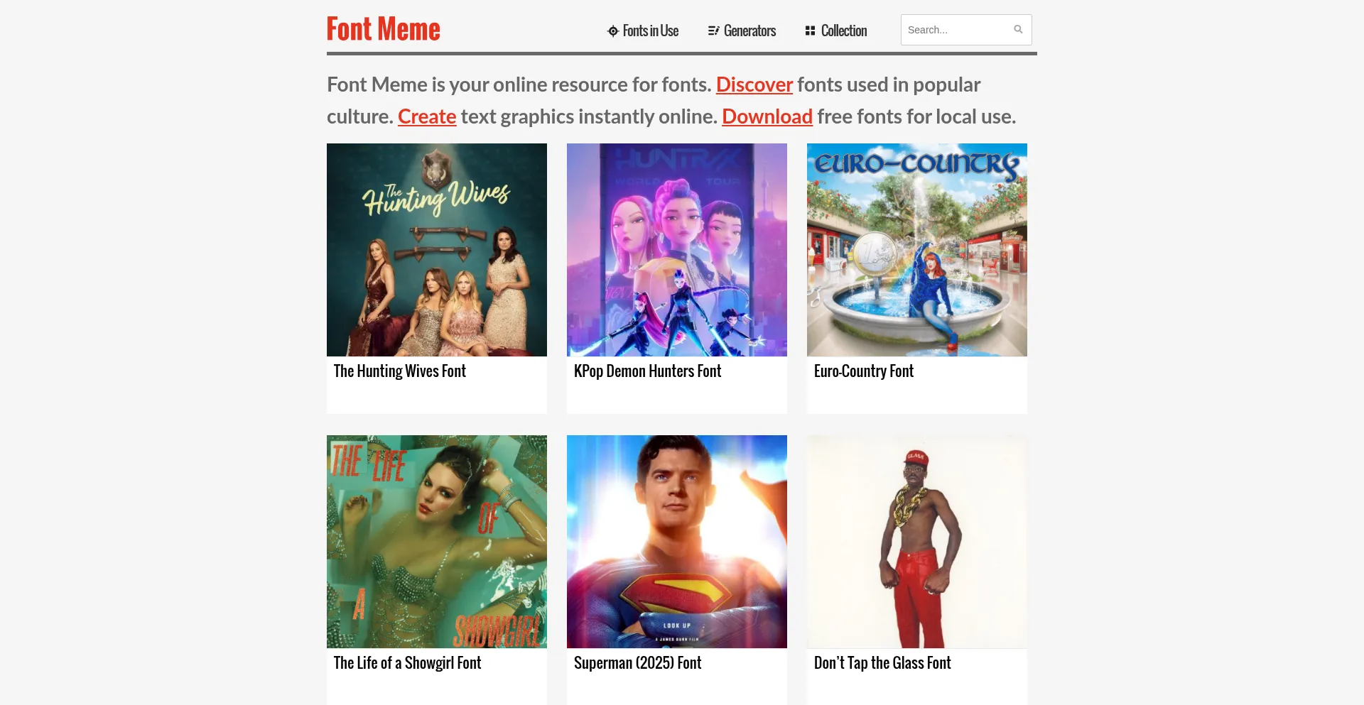 Font Meme is your online resource for fonts. Discover fonts used in popular culture. Create text graphics instantly online. Download free fonts for local use.