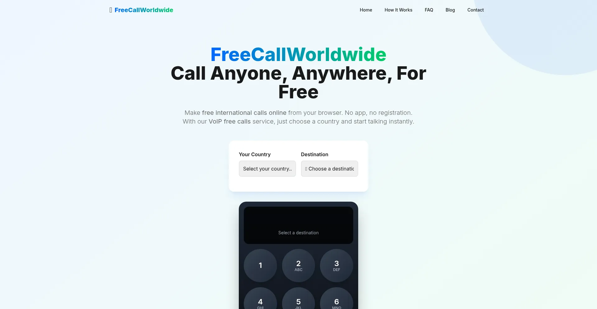 Make free international calls from your browser with FreeCallWorldwide. No app, no registration. Just choose a country and start talking instantly.