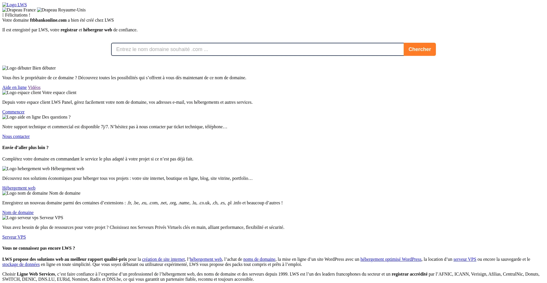 Bravo ! Votre domaine ftbbankonline.com a bien été créé avec LWS !
