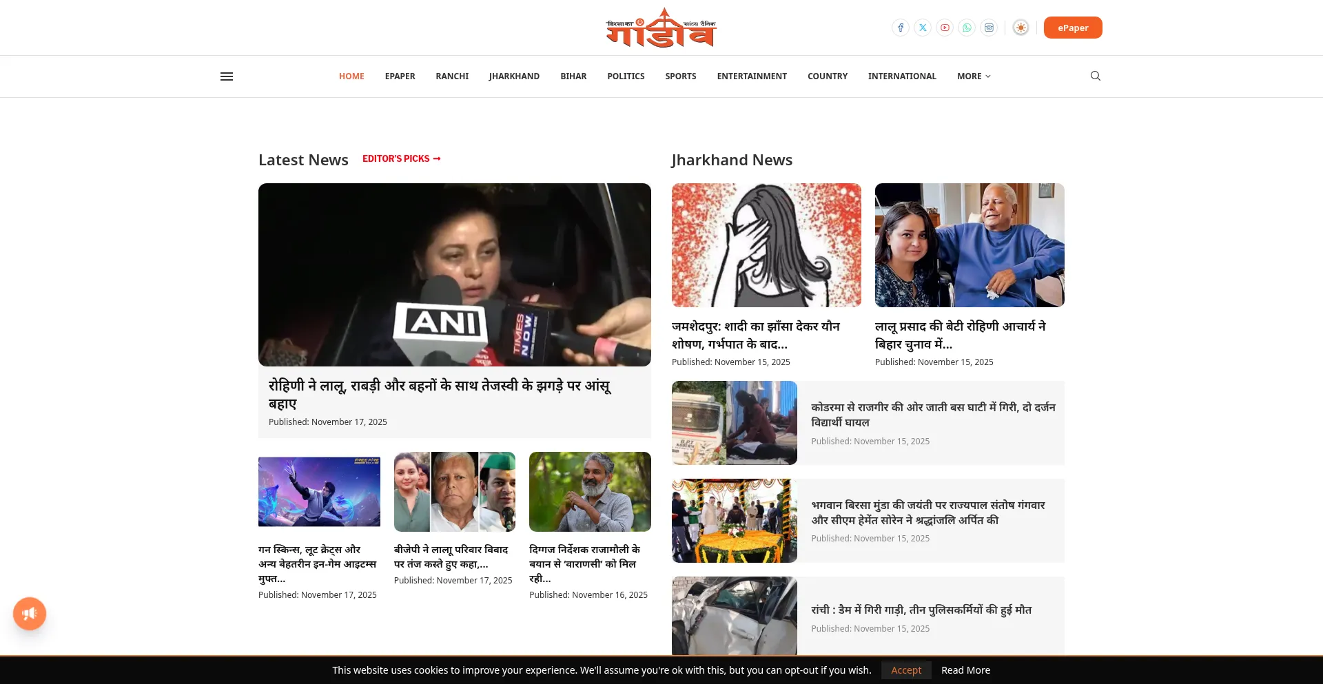 à€°à€Ÿà€‚à€šà„€ à€šà„à€Żà„‚à„› , à€à€Ÿà€°à€–à€‚à€Ą à€šà„à€Żà„‚à„›, Latest Hindi News - Gandiv Live
