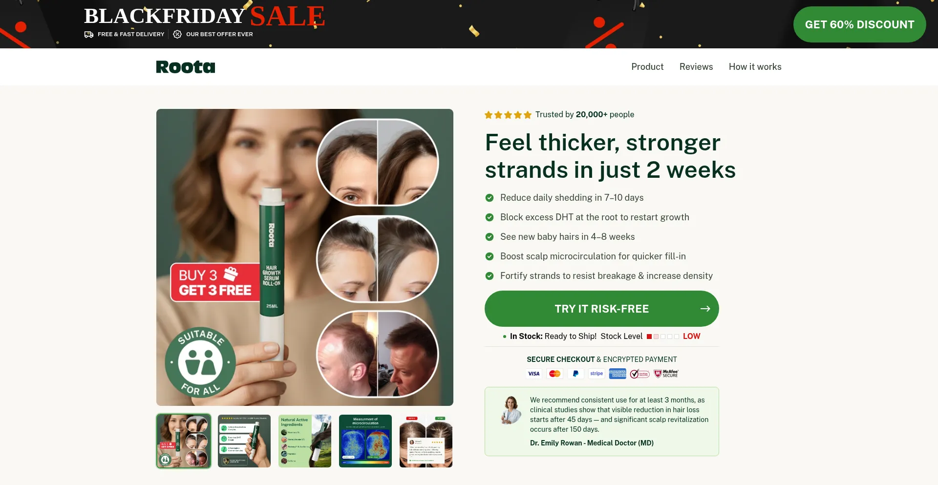 Stop hair loss and regrow thicker, stronger hair naturally. Roota's DHT-blocking roll-on serum delivers visible results in 2-4 weeks. 90-day money-back guarantee. No prescriptio...