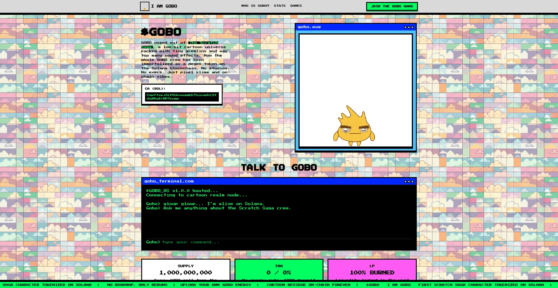 GOBO - First Scratch Saga character tokenized on Solana. Pure cartoon chaos meets blockchain. No roadmap, only reruns.