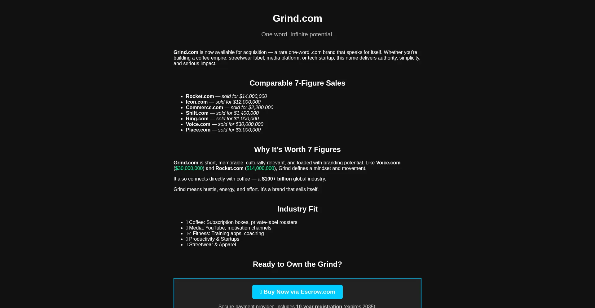Grind.com is a premium one-word domain now available for sale. Perfect for coffee, lifestyle, media, or tech branding. Serious inquiries only.