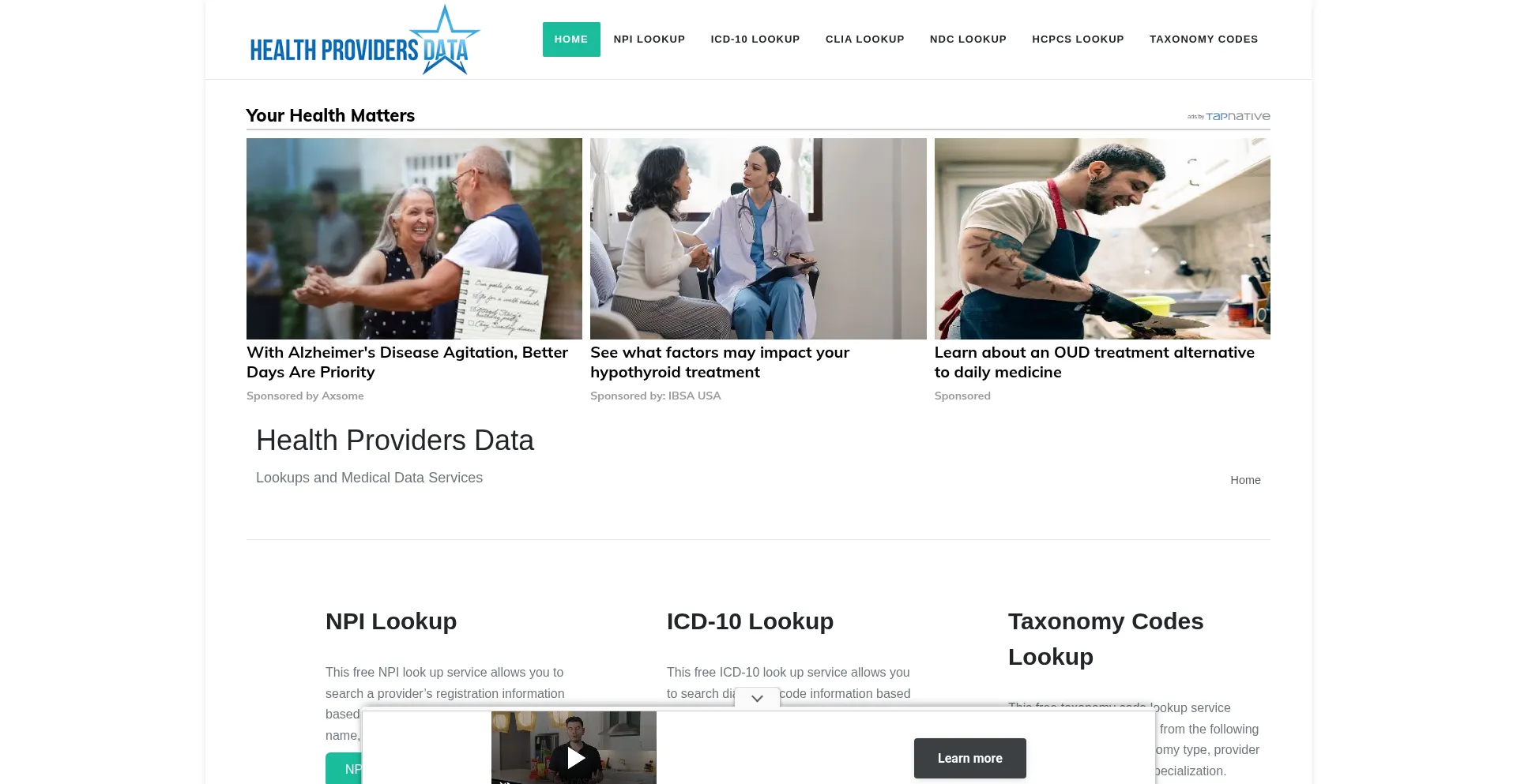 Medical data for patients and healthcare providers. Medical data look up tools for NPI numbers, ICD-10, Taxonomy, CLIA and National Drug Codes.