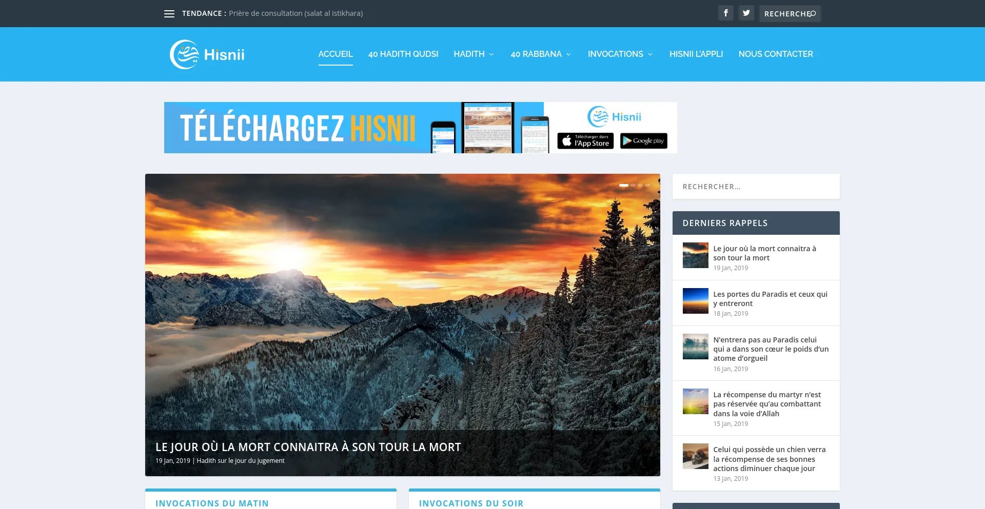 Hisnii est un site islamique proposant des Hadiths, Rappels et invocations authentiques en islam. C'est également le site officiel de la célÚbre appli, Hisnii.